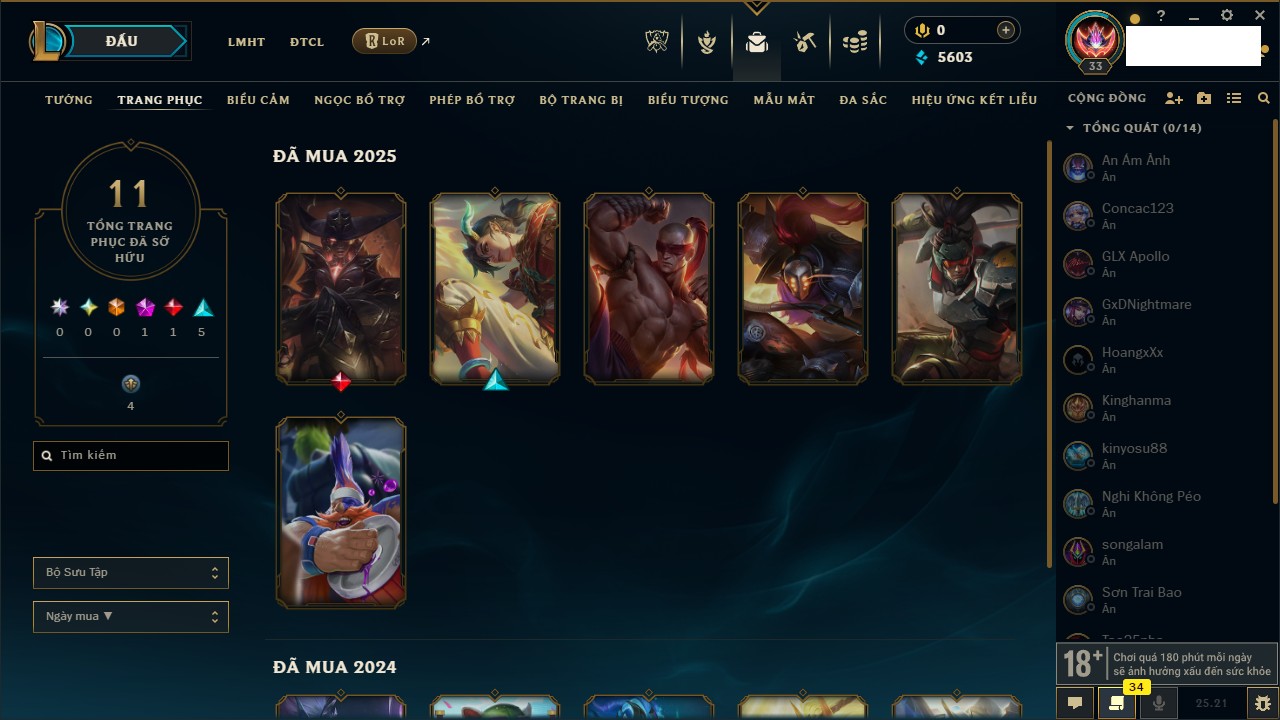 Rank Đơn: Vàng IIKhung: VàngTướng: 171 - Còn 219803 THXTrang Phục: 254Rank ĐTCL: Chưa RankLinh Thú: 78