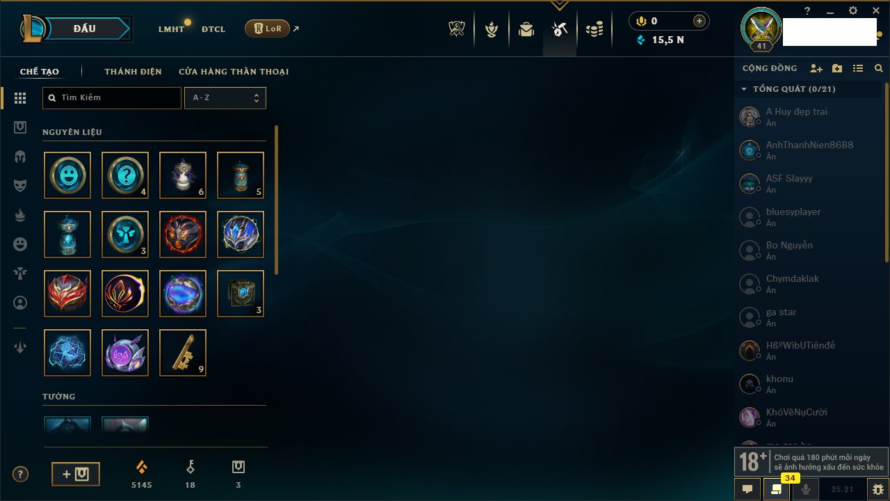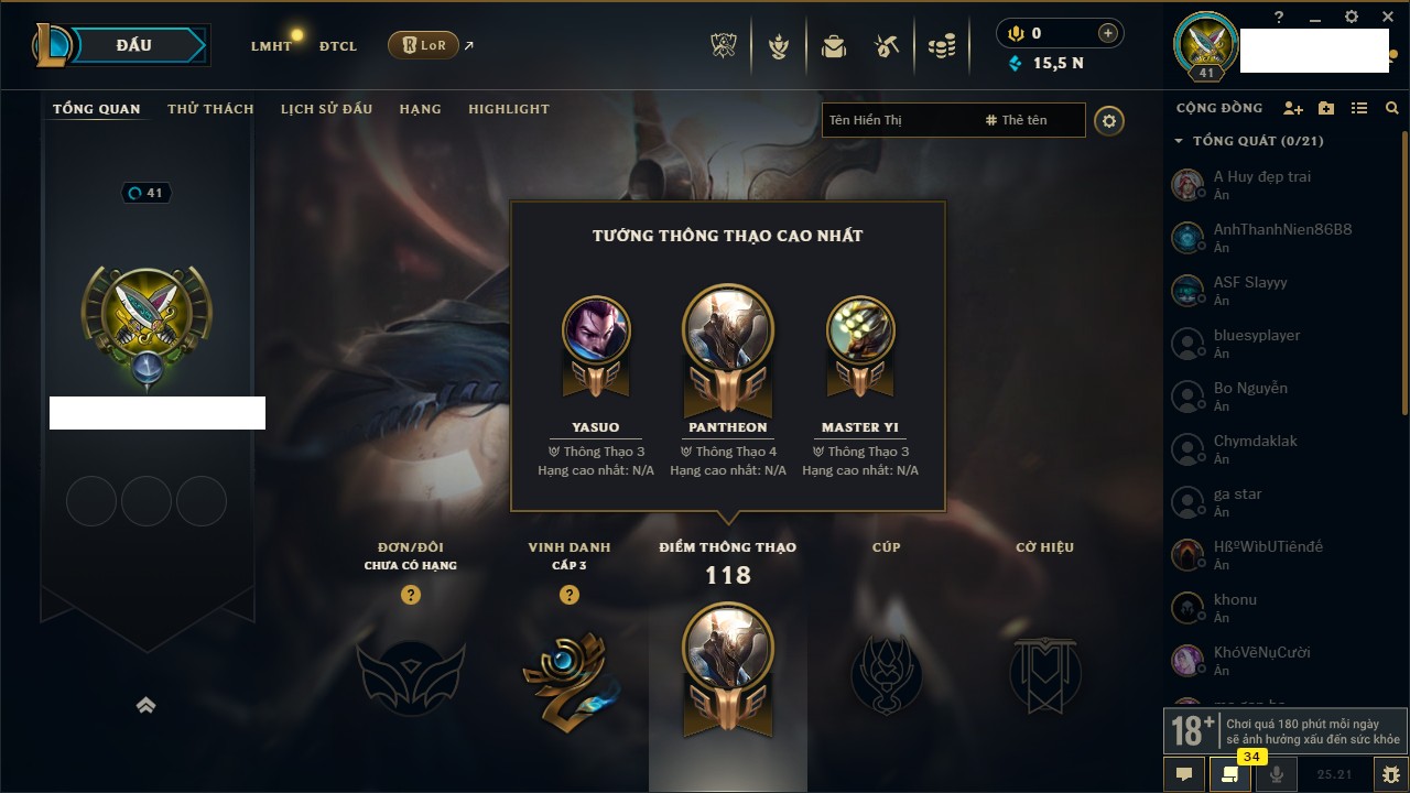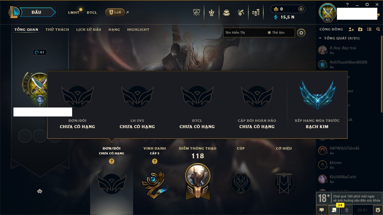 Rank Đơn: Vàng IIIKhung: BạcTướng: 171 - Còn 101359 THXTrang Phục: 88Rank ĐTCL: Kim Cương IVLinh Thú: 200