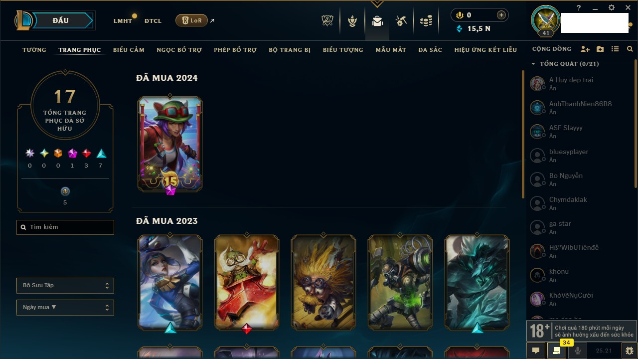 Rank Đơn: Bạc IIIKhung: Chưa có khungTướng: 163 - Còn 66843 THXTrang Phục: 182Rank ĐTCL: Kim Cương IVLinh Thú: 114