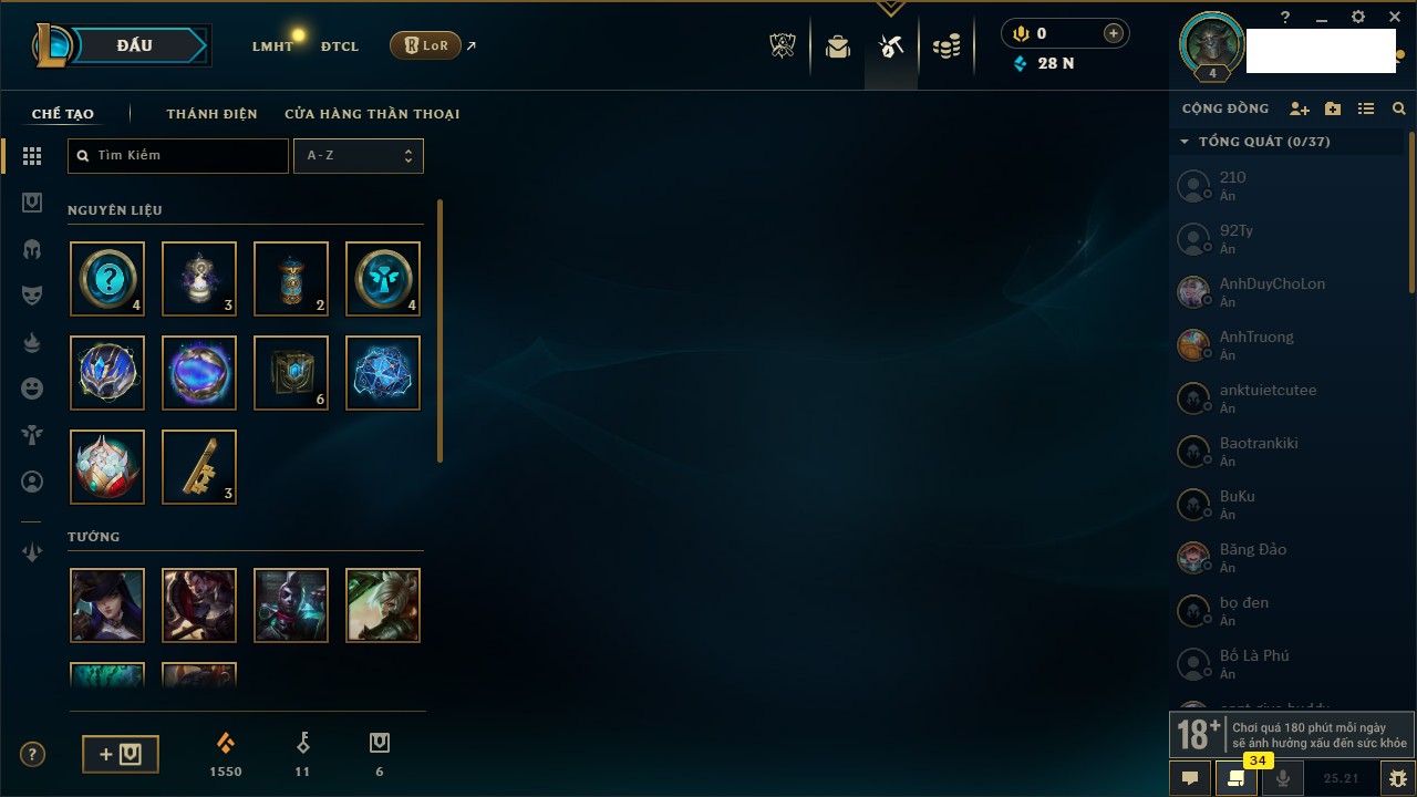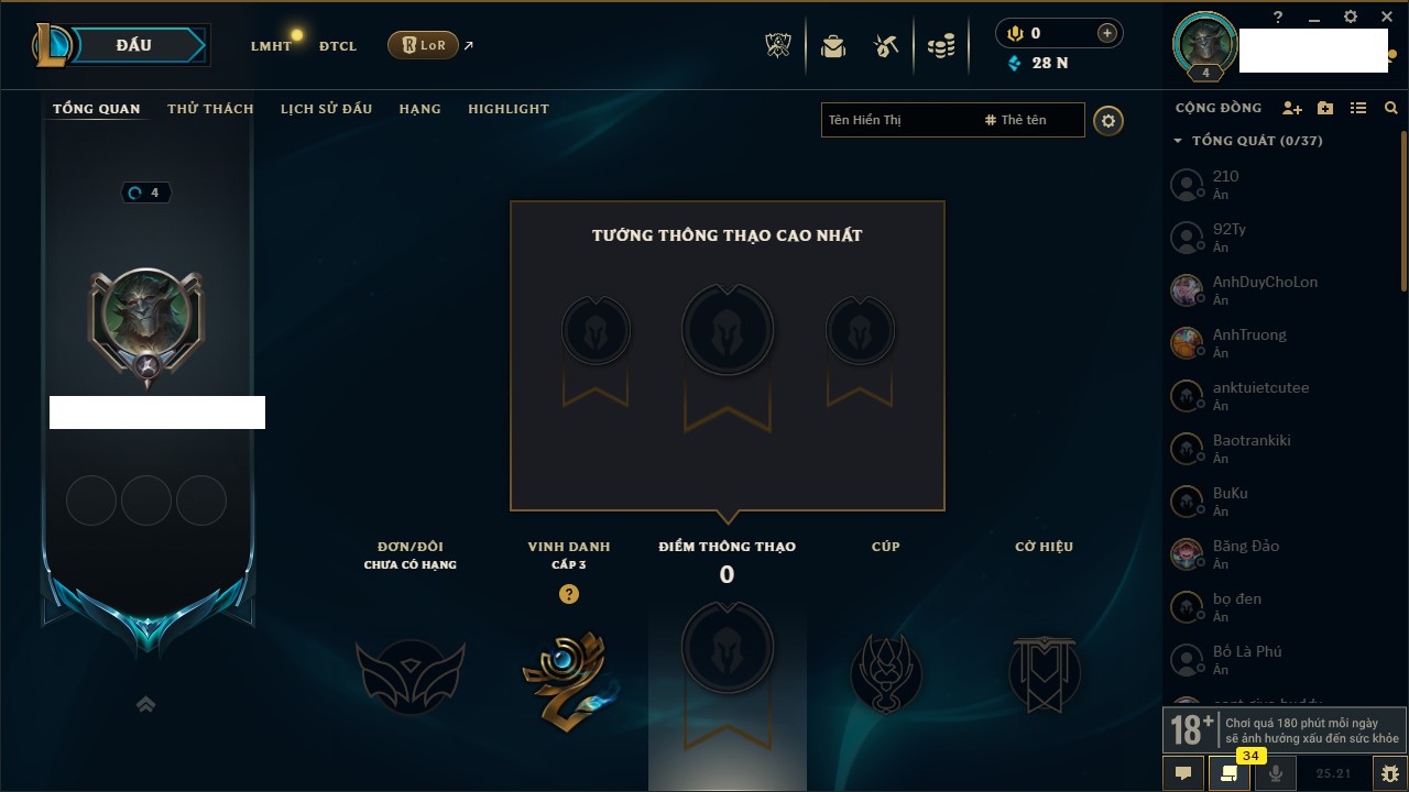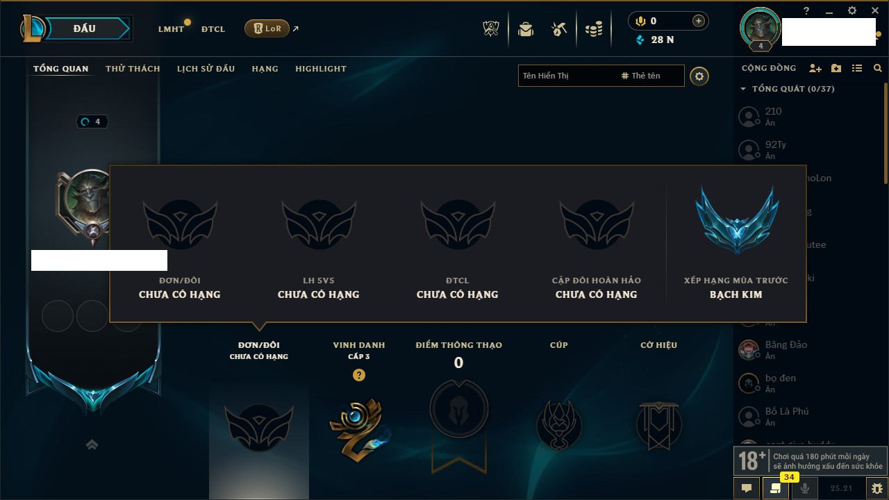 Rank Đơn: Vàng IIIKhung: BạcTướng: 171 - Còn 101359 THXTrang Phục: 88Rank ĐTCL: Kim Cương IVLinh Thú: 200