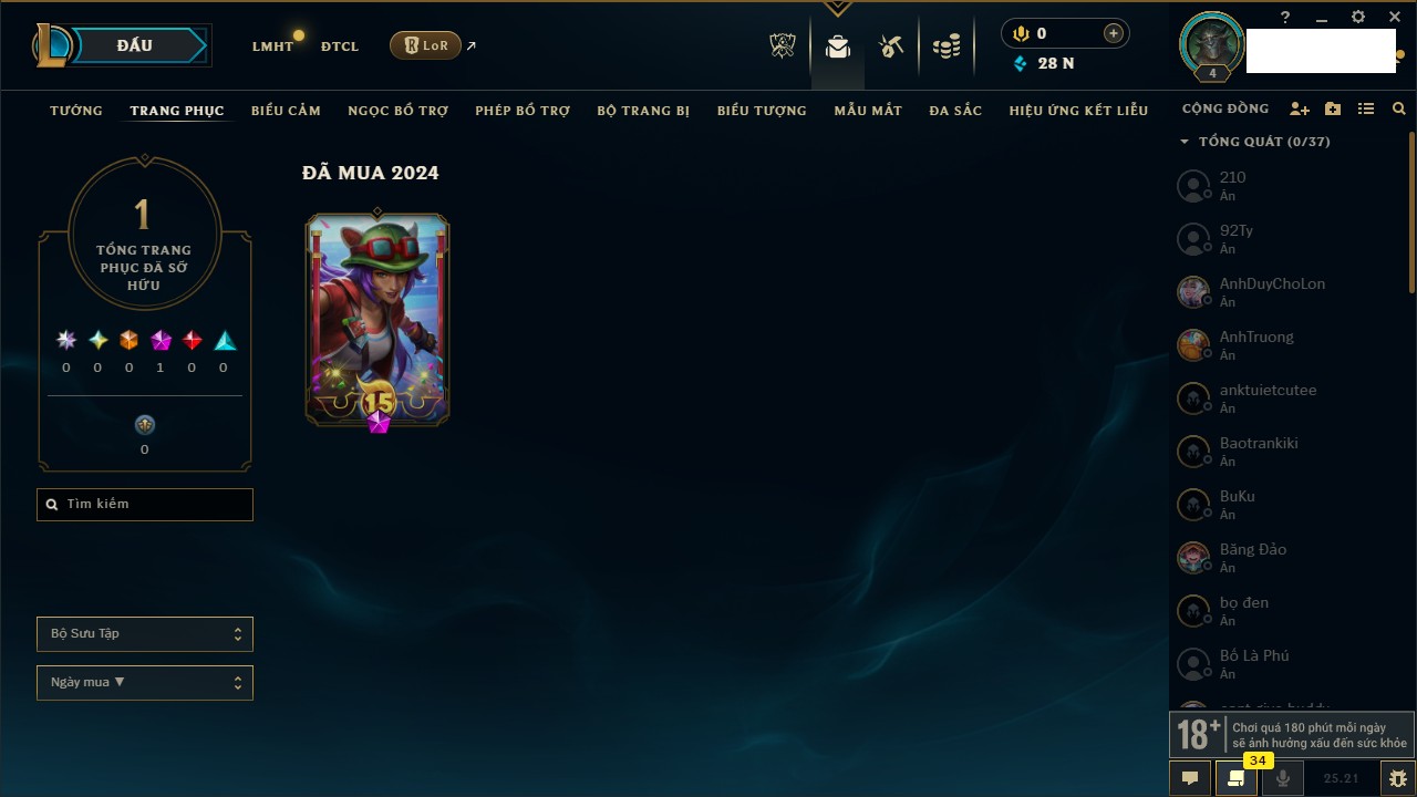 Rank Đơn: Đồng IVKhung: ĐồngTướng: 167 - Còn 28219 THXTrang Phục: 187Rank ĐTCL: Chưa RankLinh Thú: 112