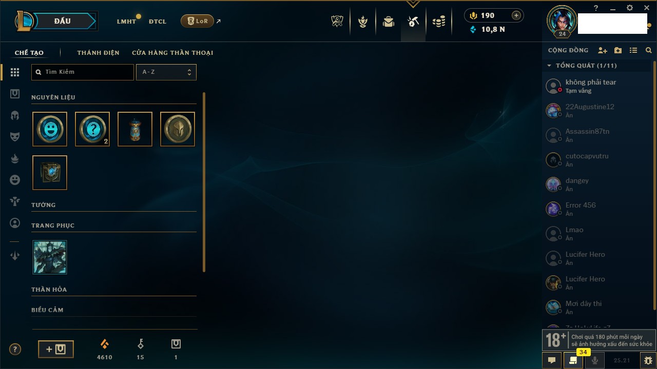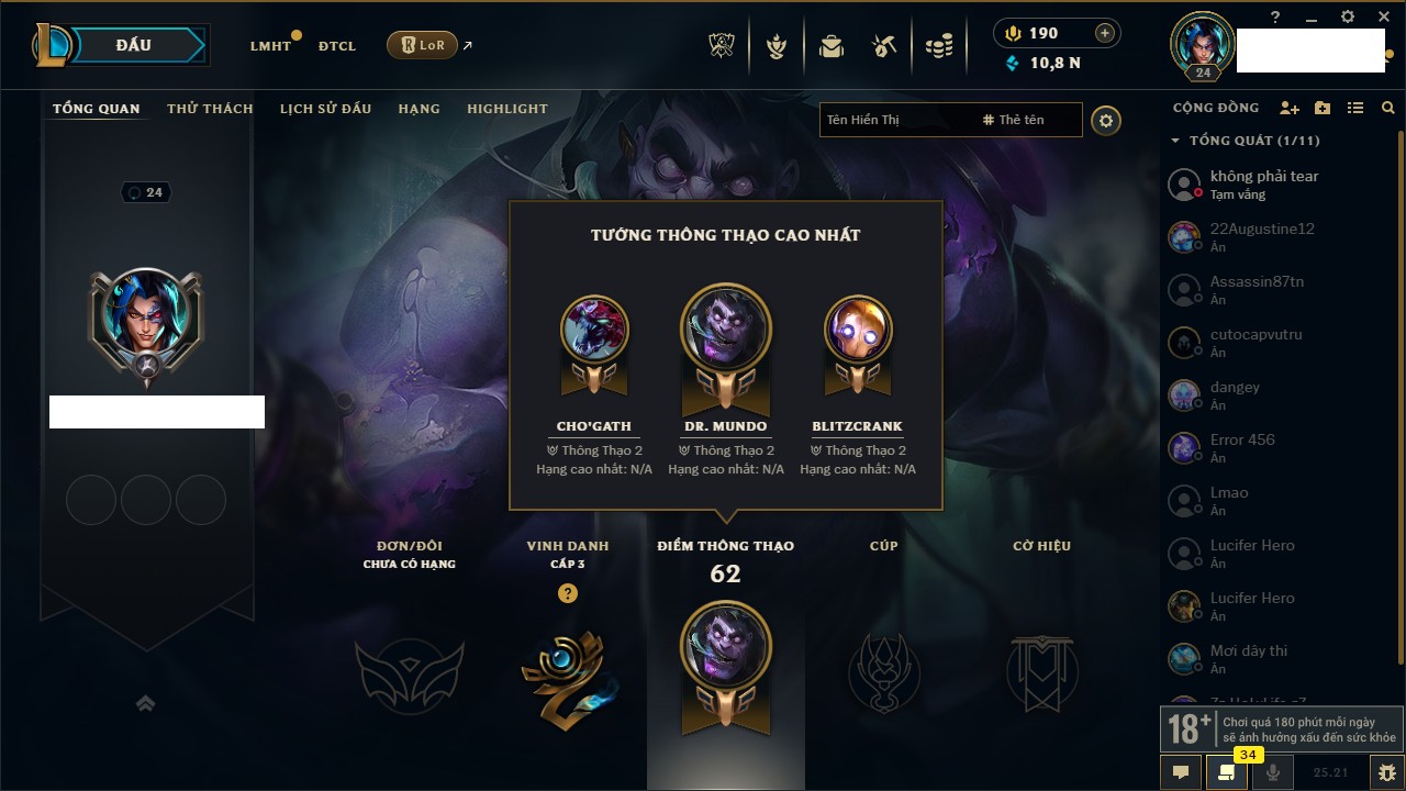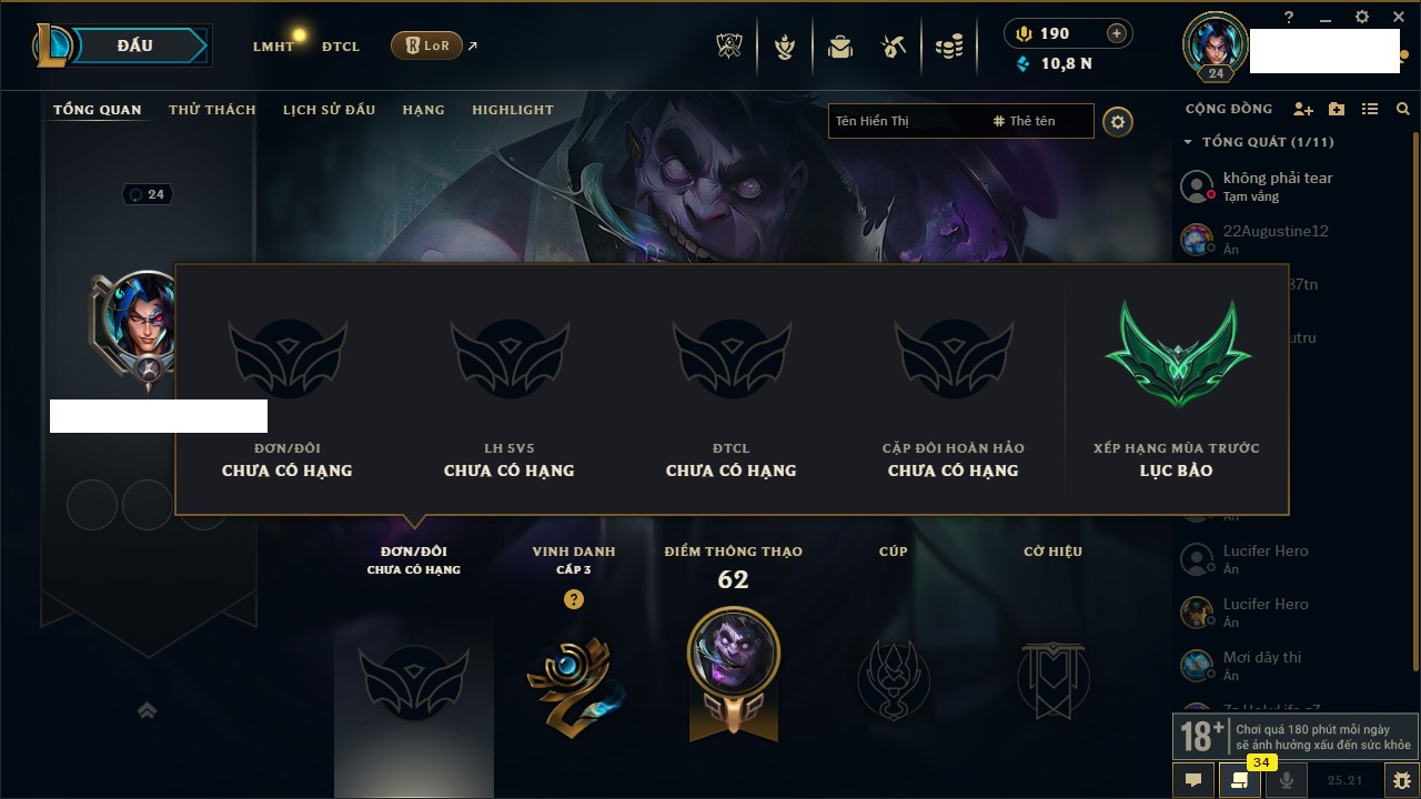 Rank Đơn: Chưa rank mùa nào Khung: Chưa có khung Tướng: 56 - Còn 2186 THX Trang Phục: 1 Rank ĐTCL: Chưa Rank Linh Thú: 25