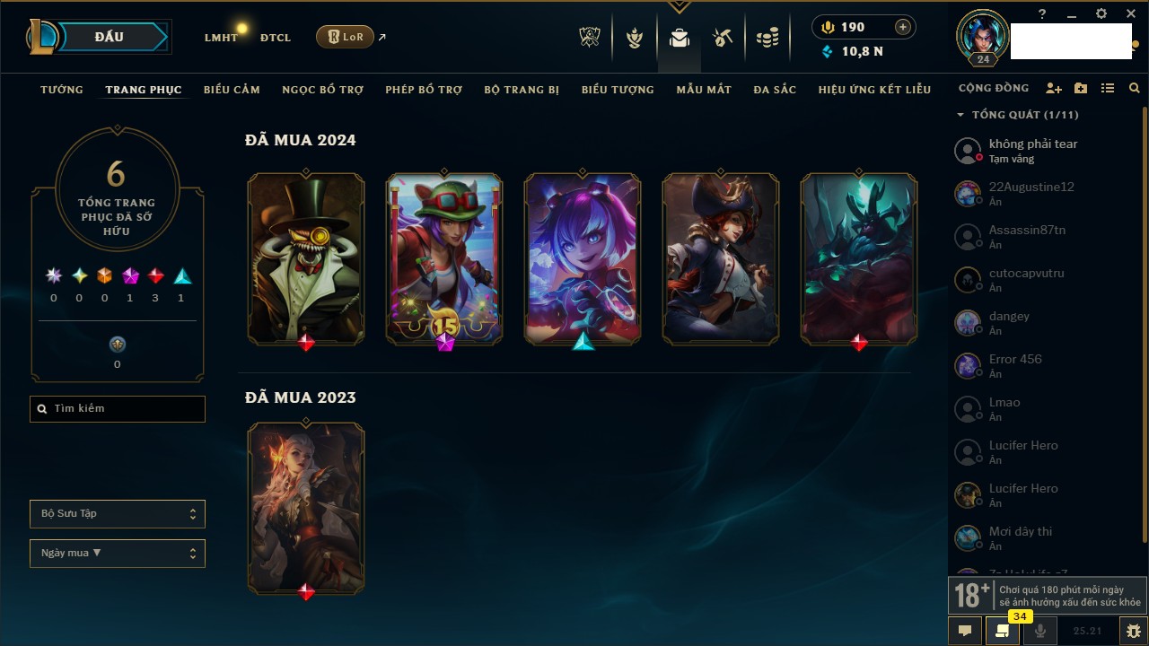 Rank Đơn: Chưa rank mùa nào Khung: Chưa có khung Tướng: 23 - Còn 19045 THX Trang Phục: 2 Rank ĐTCL: Rank Cao Thủ Linh Thú: 114