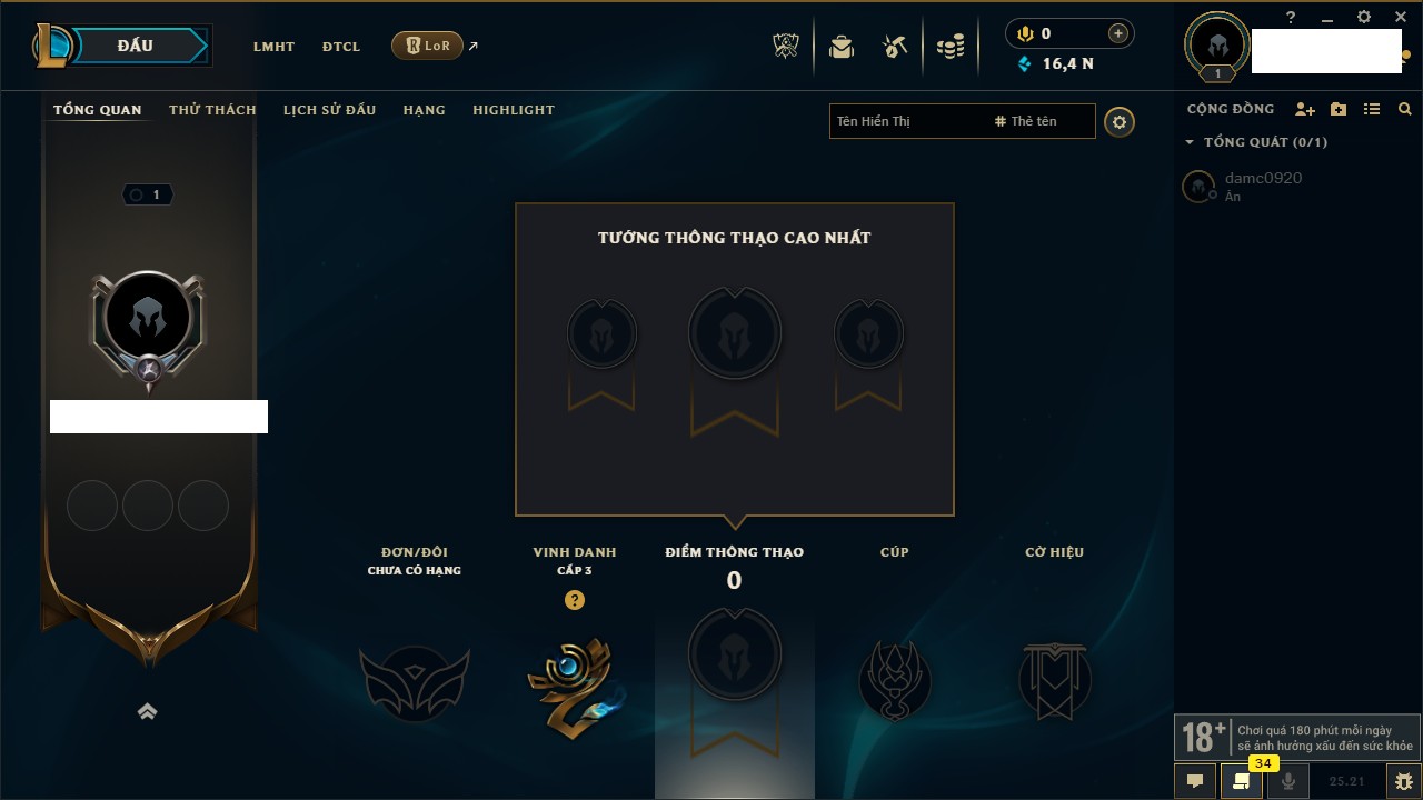 Rank Đơn: Vàng IIIKhung: VàngTướng: 172 - Còn 164704 THXTrang Phục: 255Rank ĐTCL: Kim Cương IVLinh Thú: 156