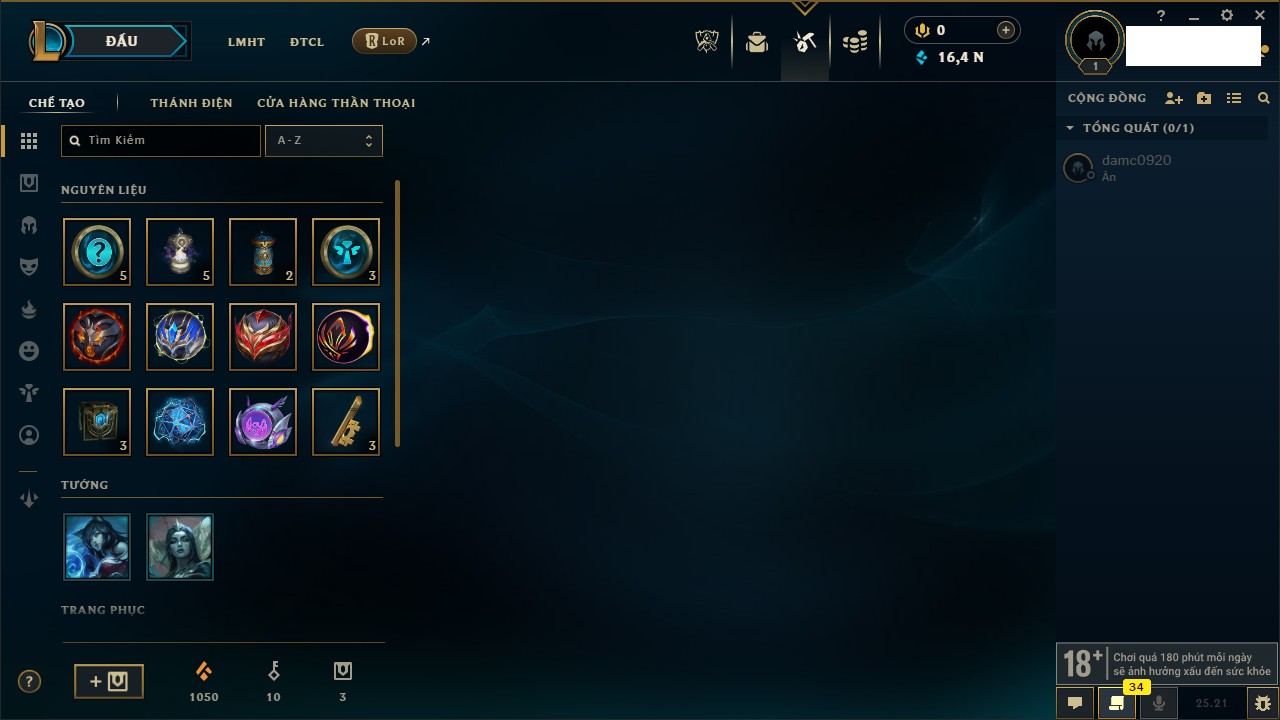 Rank Đơn: Lục Bảo IVKhung: VàngTướng: 171 - Còn 154648 THXTrang Phục: 203Rank ĐTCL: Bạch Kim IVLinh Thú: 69