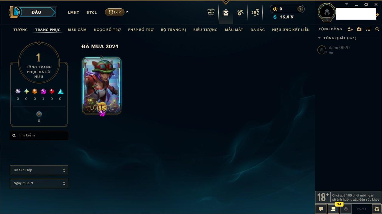 Rank Đơn: Đồng IIKhung: ĐồngTướng: 170 - Còn 95773 THXTrang Phục: 170Rank ĐTCL: Chưa RankLinh Thú: 32