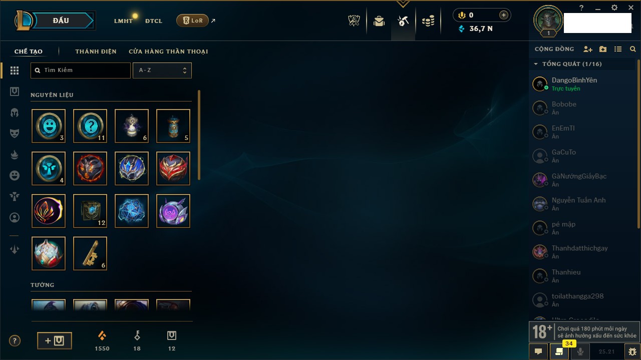 Rank Đơn: Lục Bảo IVKhung: VàngTướng: 171 - Còn 154648 THXTrang Phục: 203Rank ĐTCL: Bạch Kim IVLinh Thú: 69