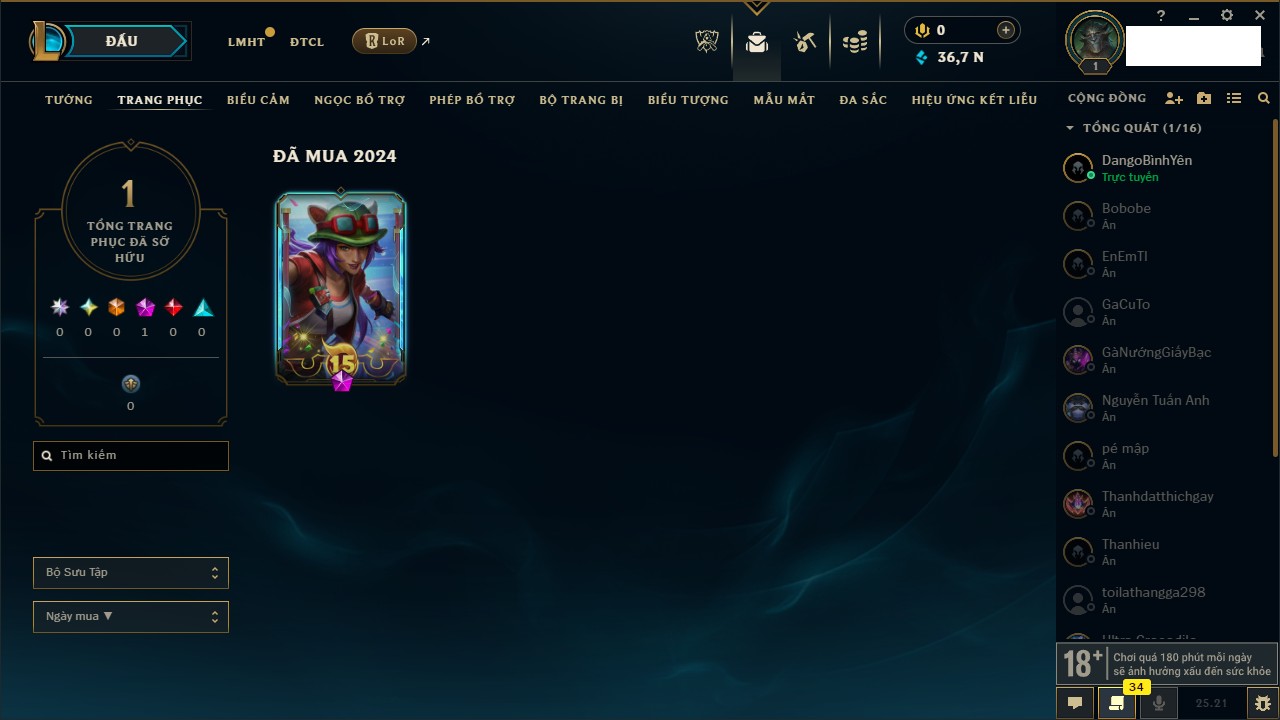 Rank Đơn: Đồng IIKhung: ĐồngTướng: 170 - Còn 95773 THXTrang Phục: 170Rank ĐTCL: Chưa RankLinh Thú: 32