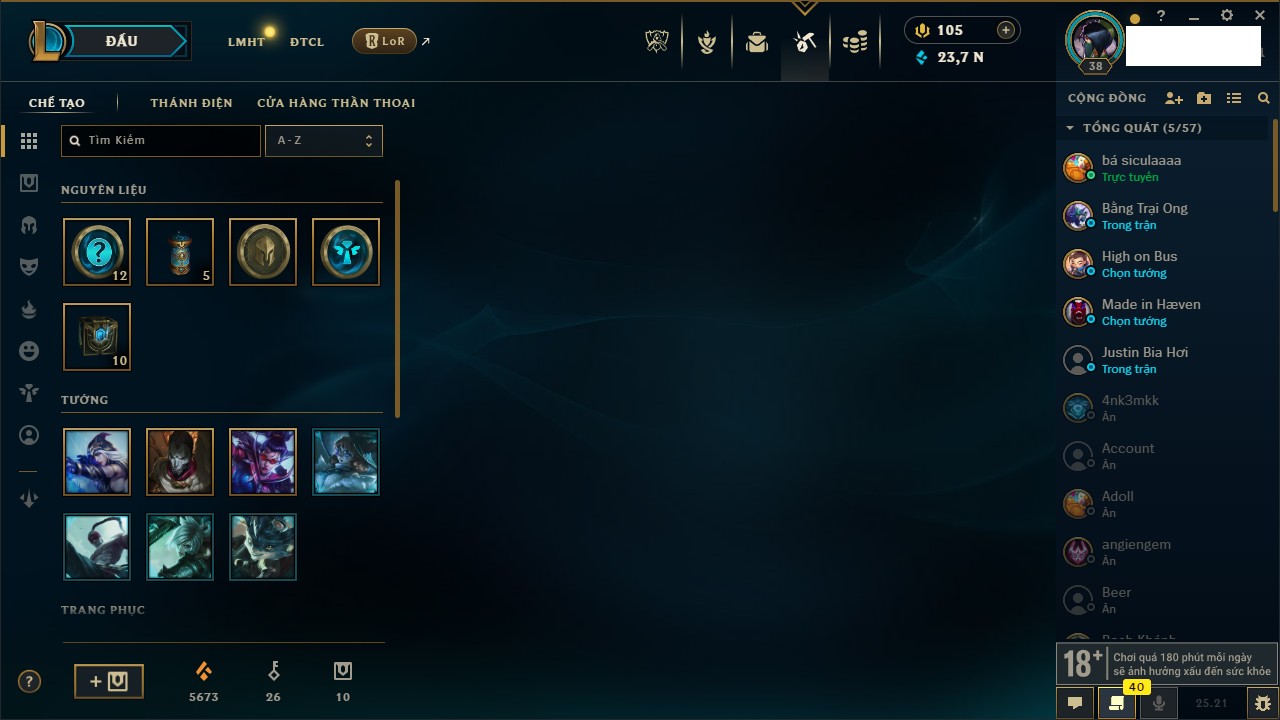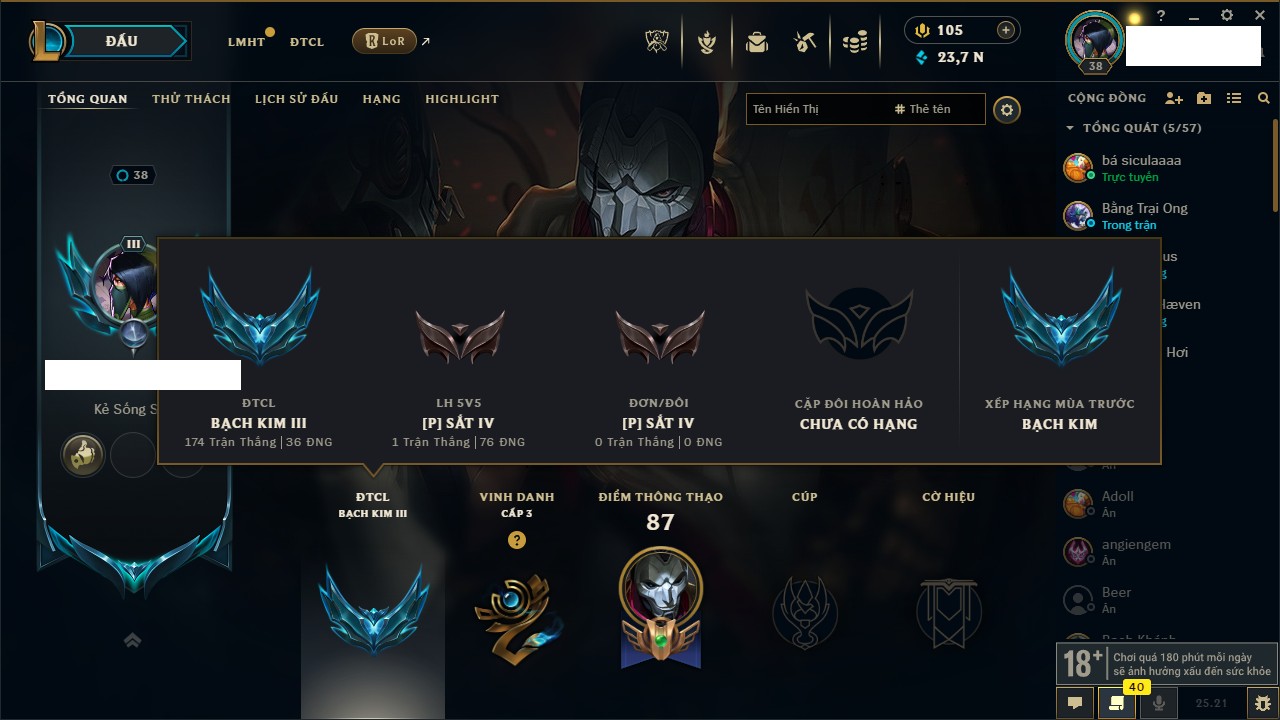 Rank Đơn: Vàng IIIKhung: BạcTướng: 171 - Còn 101359 THXTrang Phục: 88Rank ĐTCL: Kim Cương IVLinh Thú: 200