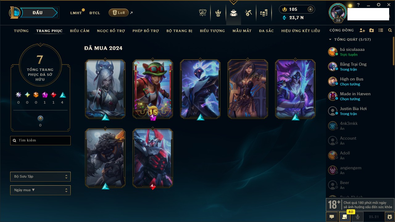 Rank Đơn: Bạc IIIKhung: Chưa có khungTướng: 163 - Còn 66843 THXTrang Phục: 182Rank ĐTCL: Kim Cương IVLinh Thú: 114