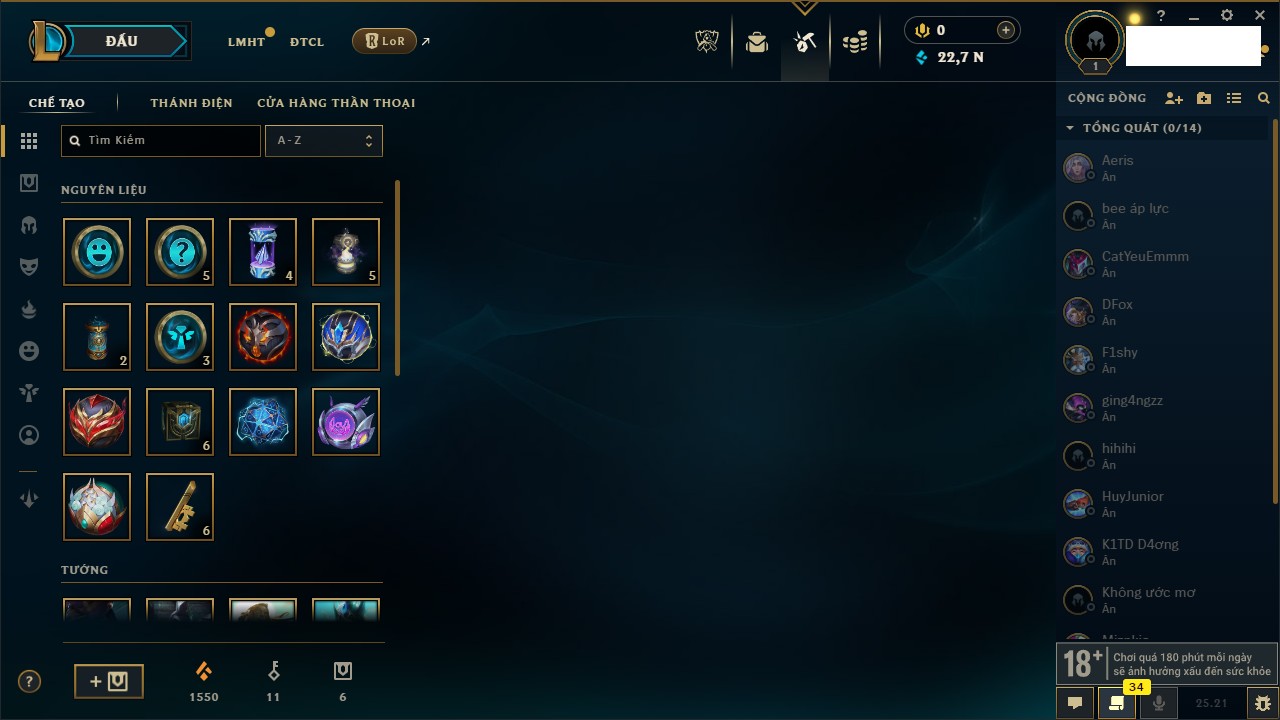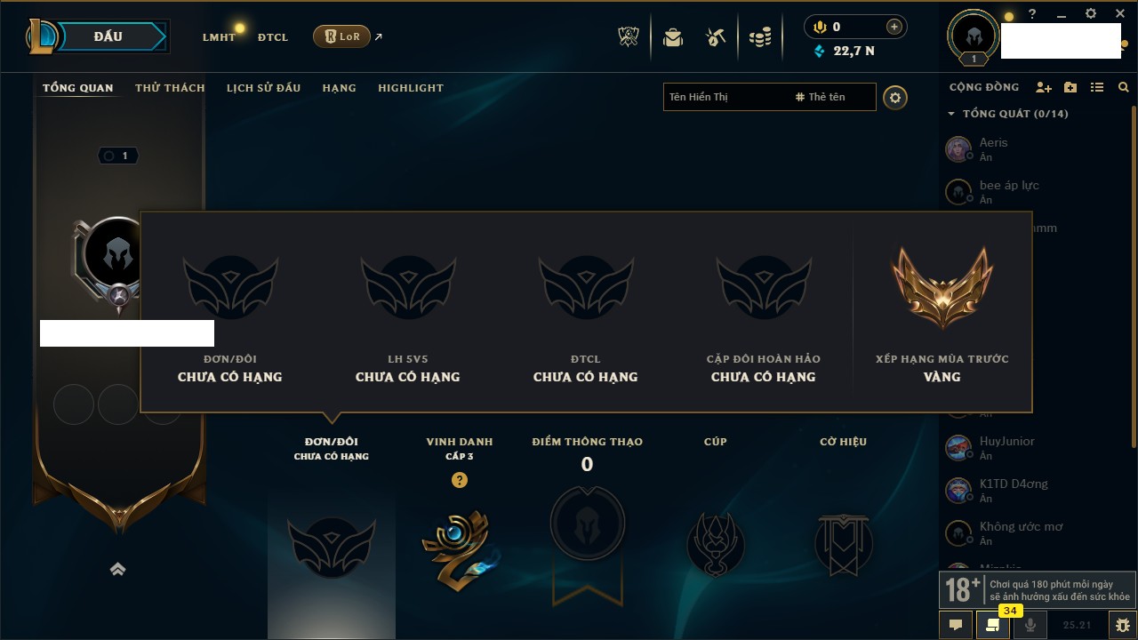 Rank Đơn: Bạc IIKhung: Bạch kimTướng: 169 - Còn 81813 THXTrang Phục: 301Rank ĐTCL: Chưa RankLinh Thú: 140