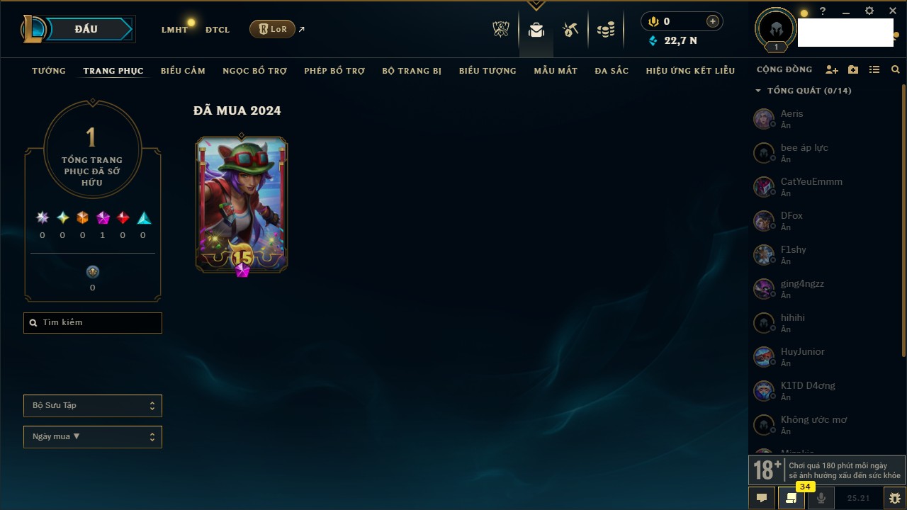 Rank Đơn: Chưa RankKhung: Chưa có khungTướng: 165 - Còn 1609 THXTrang Phục: 25Rank ĐTCL: Chưa RankLinh Thú: 44