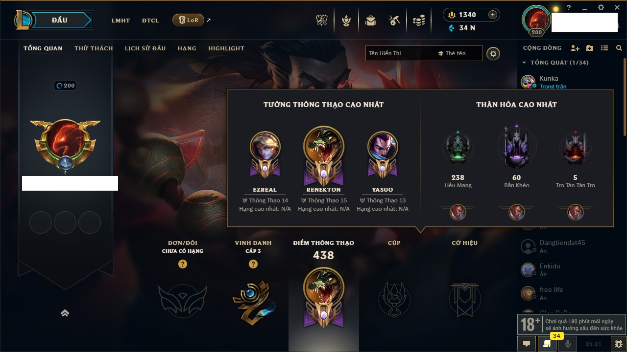 Rank Đơn: Sắt IVKhung: SắtTướng: 171 - Còn 231744 THXTrang Phục: 376Rank ĐTCL: Bạch Kim IILinh Thú: 120