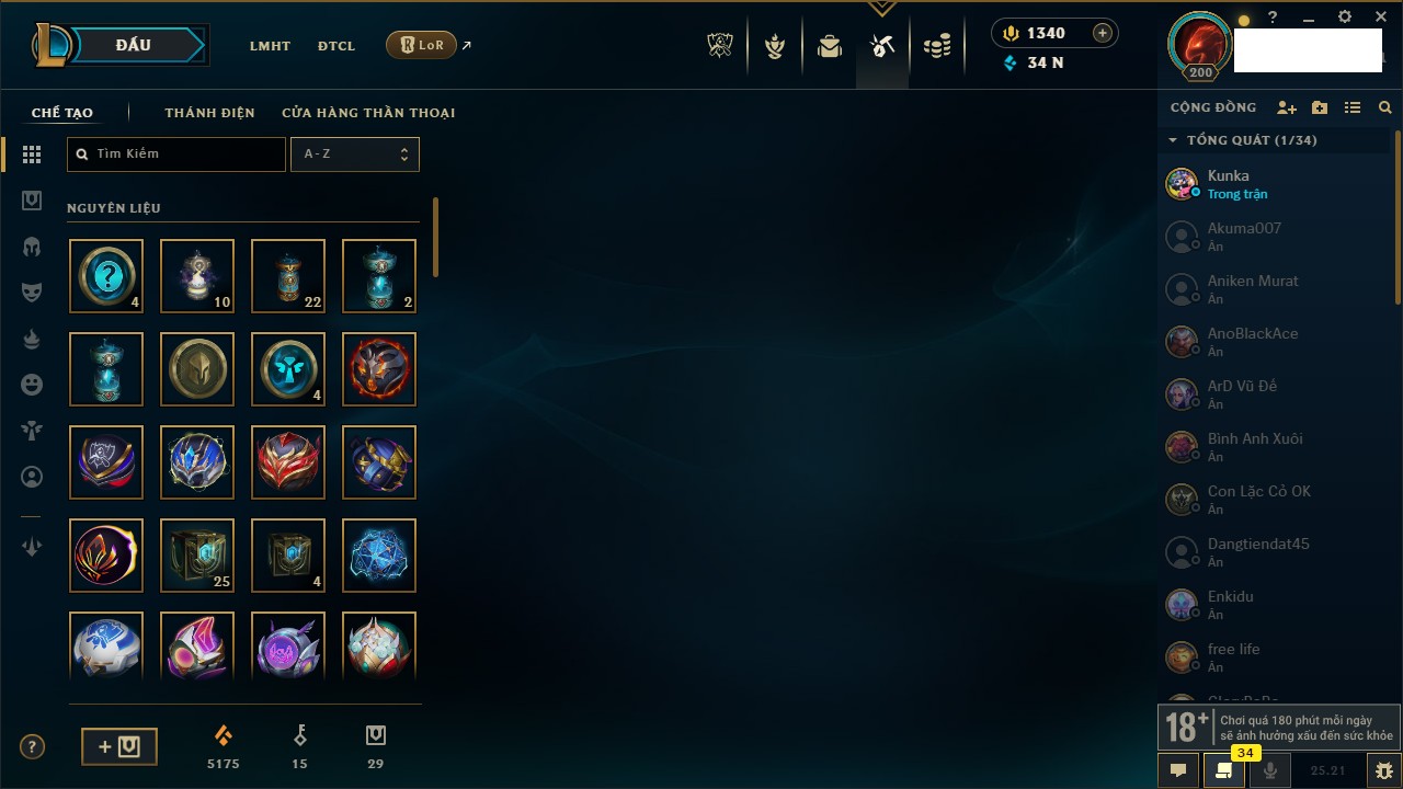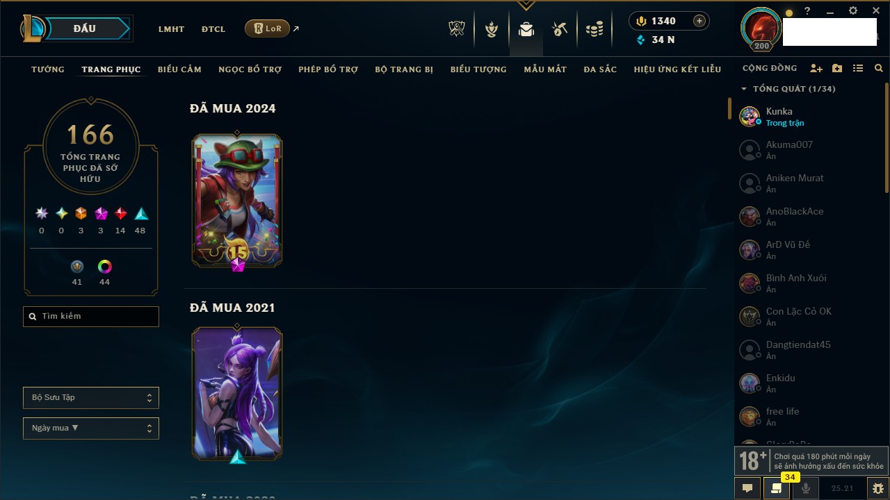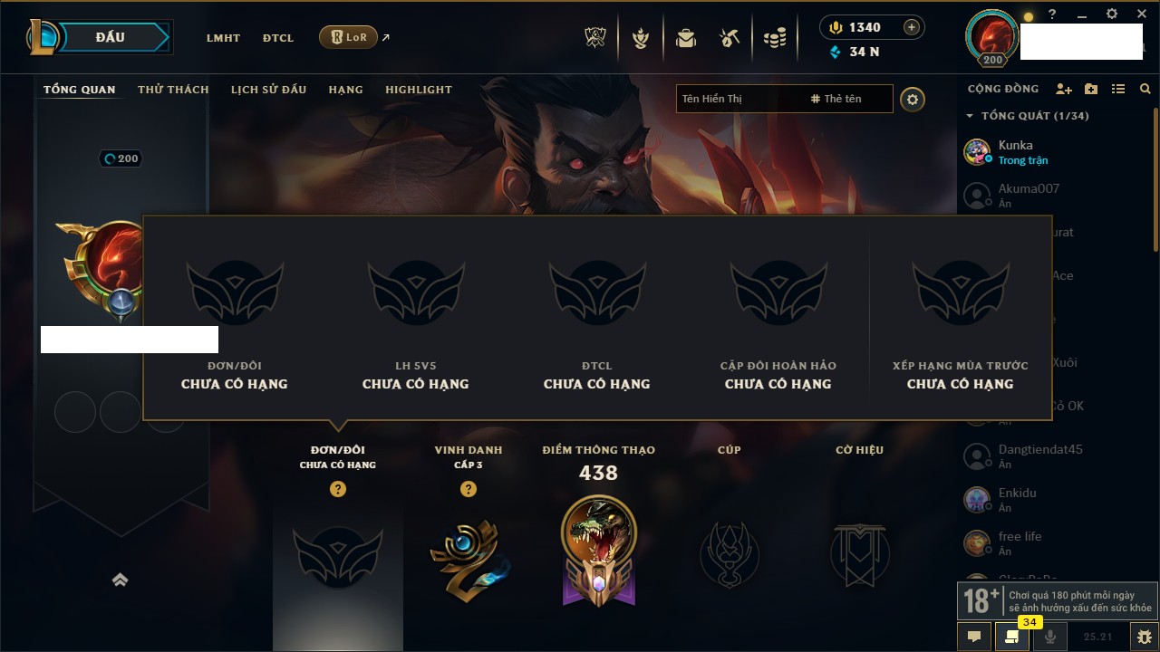 Rank Đơn: Bạc IIKhung: Bạch kimTướng: 169 - Còn 81813 THXTrang Phục: 301Rank ĐTCL: Chưa RankLinh Thú: 140