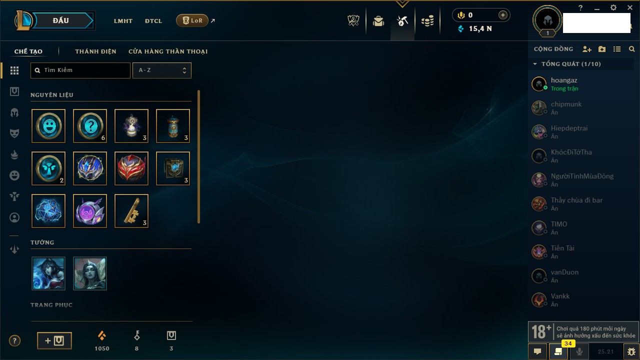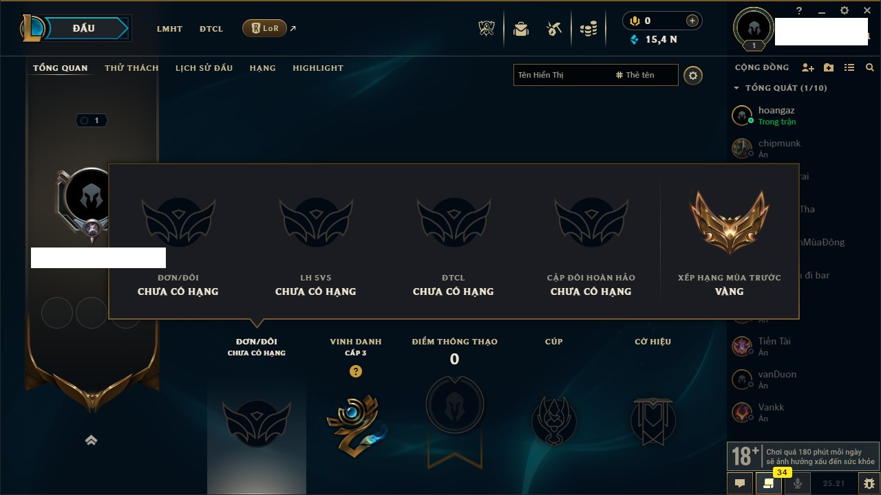 Rank Đơn: Vàng IIIKhung: BạcTướng: 171 - Còn 101359 THXTrang Phục: 88Rank ĐTCL: Kim Cương IVLinh Thú: 200