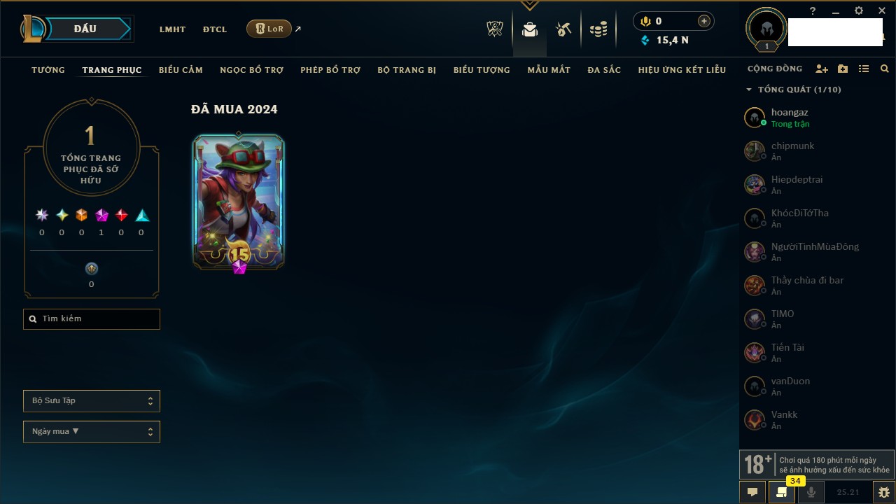 Rank Đơn: Đồng IIKhung: ĐồngTướng: 170 - Còn 66145 THXTrang Phục: 215Rank ĐTCL: Chưa RankLinh Thú: 52