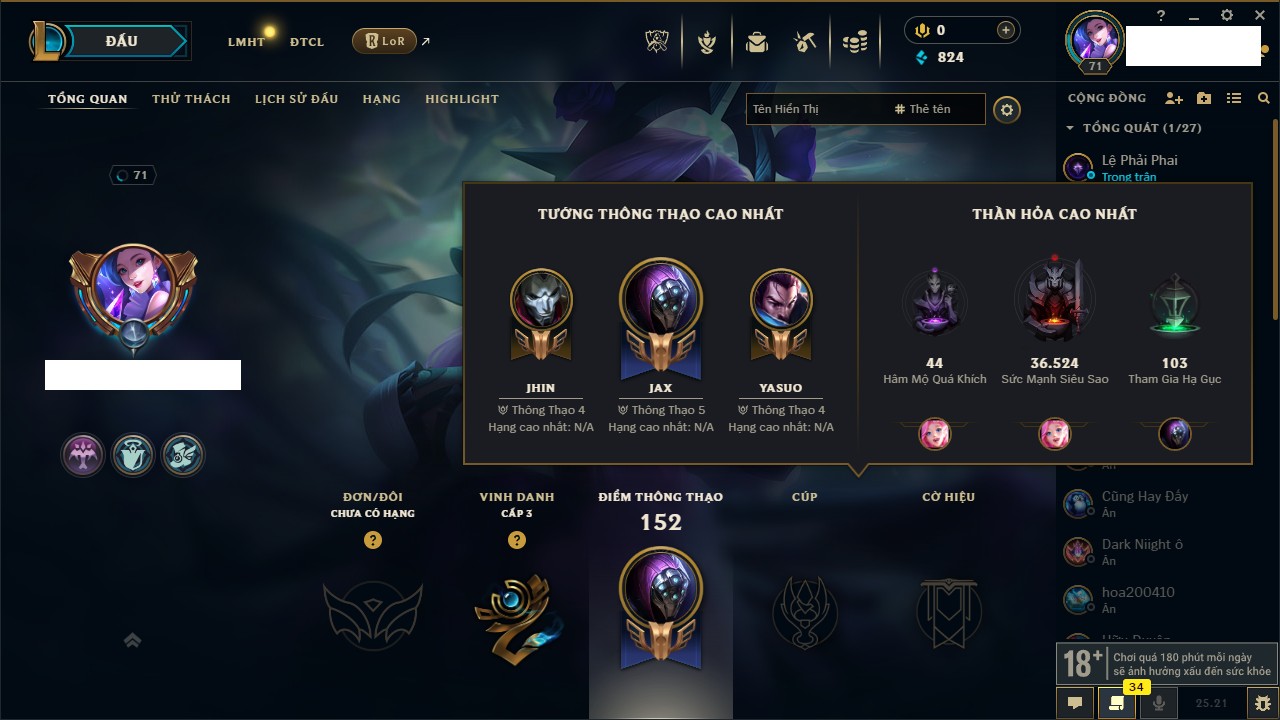Rank Đơn: Sắt IKhung: Chưa có khungTướng: 171 - Còn 89600 THXTrang Phục: 513Rank ĐTCL: Chưa RankLinh Thú: 57