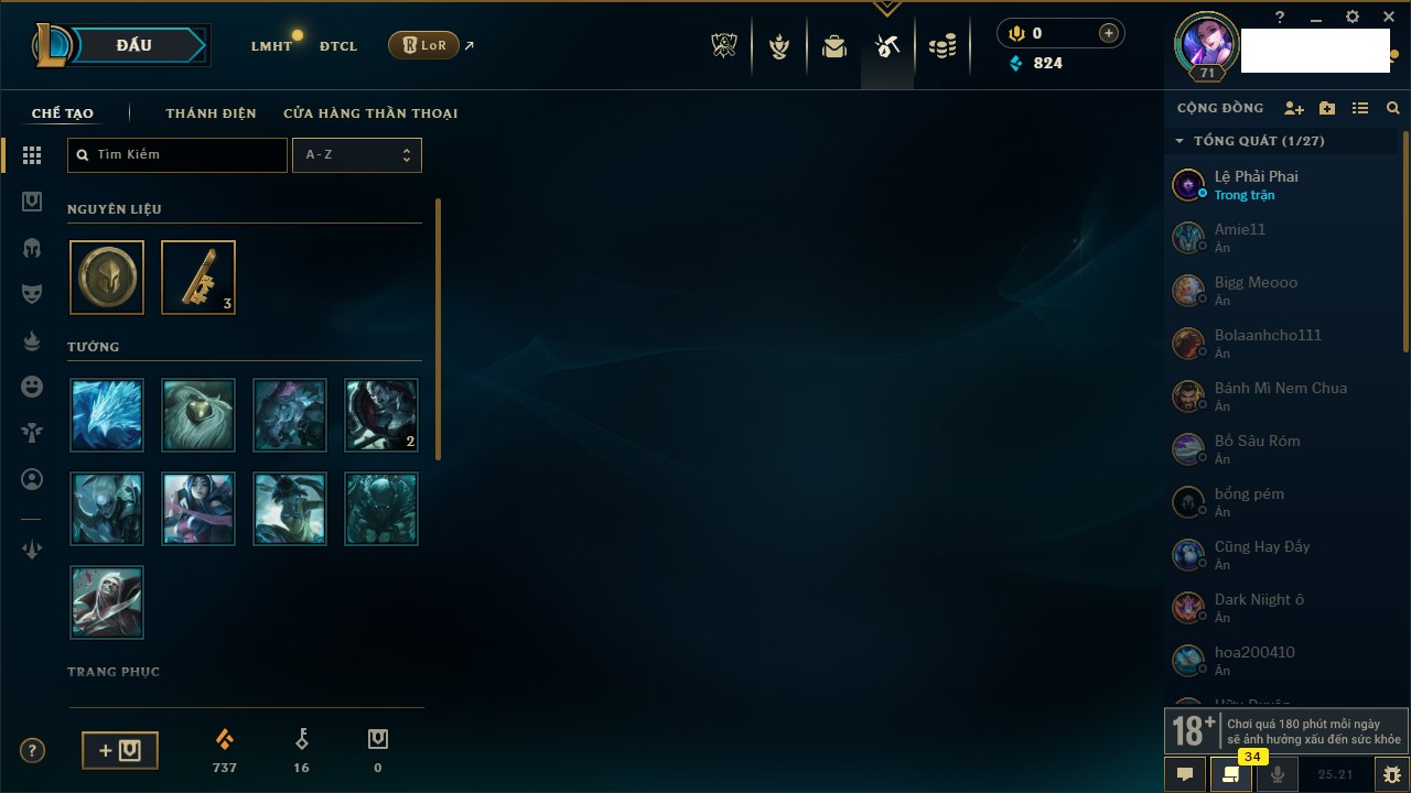 Rank Đơn: Chưa rank mùa nàoKhung: Chưa có khungTướng: 32 - Còn 16895 THXTrang Phục: 5Rank ĐTCL: Lục Bảo IVLinh Thú: 70