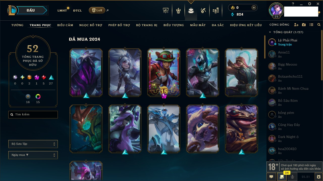Rank Đơn: Chưa RankKhung: Chưa có khungTướng: 170 - Còn 72514 THXTrang Phục: 202Rank ĐTCL: Chưa RankLinh Thú: 191