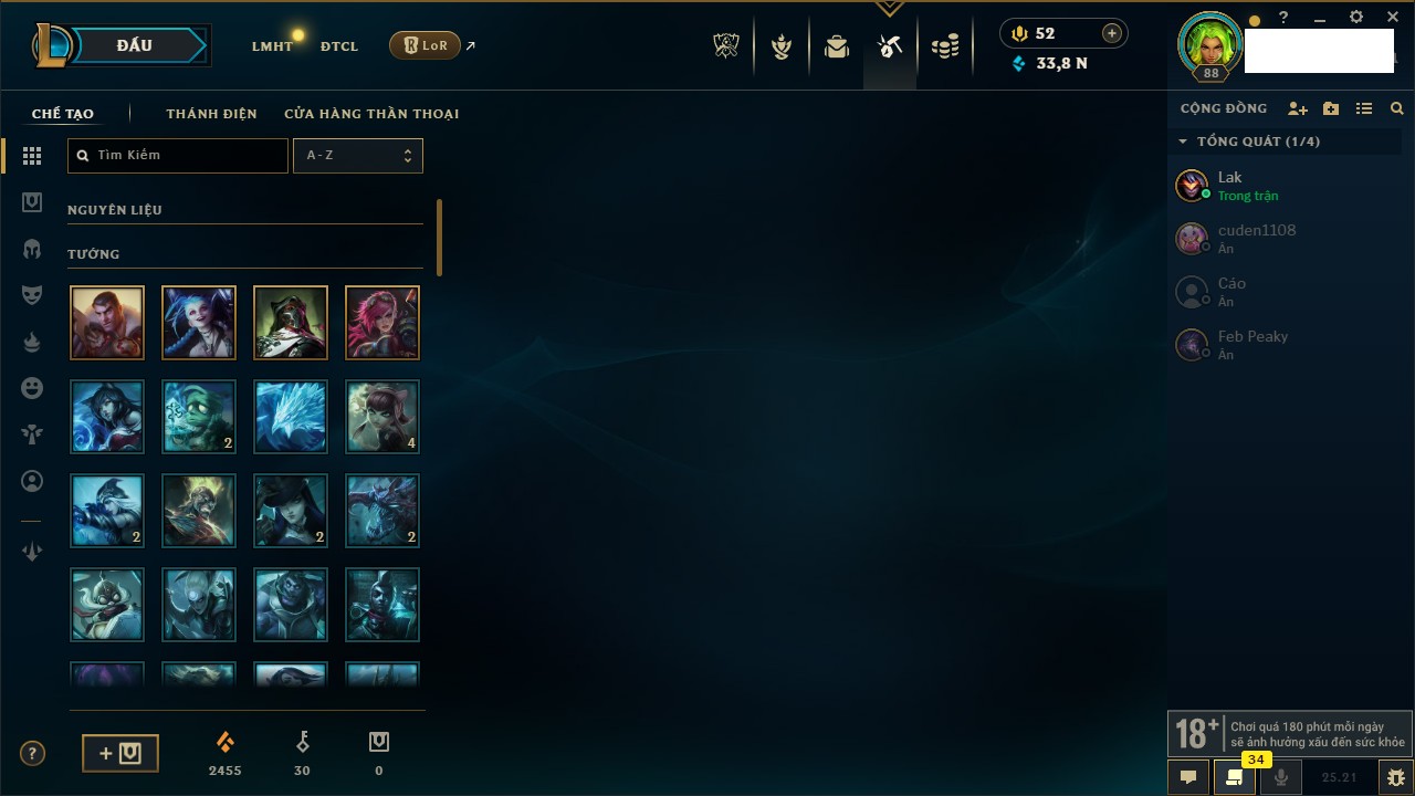Rank Đơn: Lục Bảo IVKhung: VàngTướng: 171 - Còn 154648 THXTrang Phục: 203Rank ĐTCL: Bạch Kim IVLinh Thú: 69
