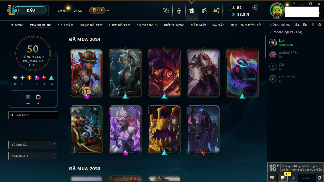 Rank Đơn: Vàng IIIKhung: VàngTướng: 172 - Còn 164704 THXTrang Phục: 255Rank ĐTCL: Kim Cương IVLinh Thú: 156