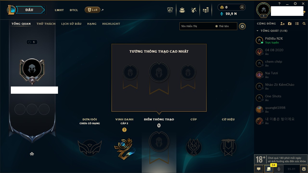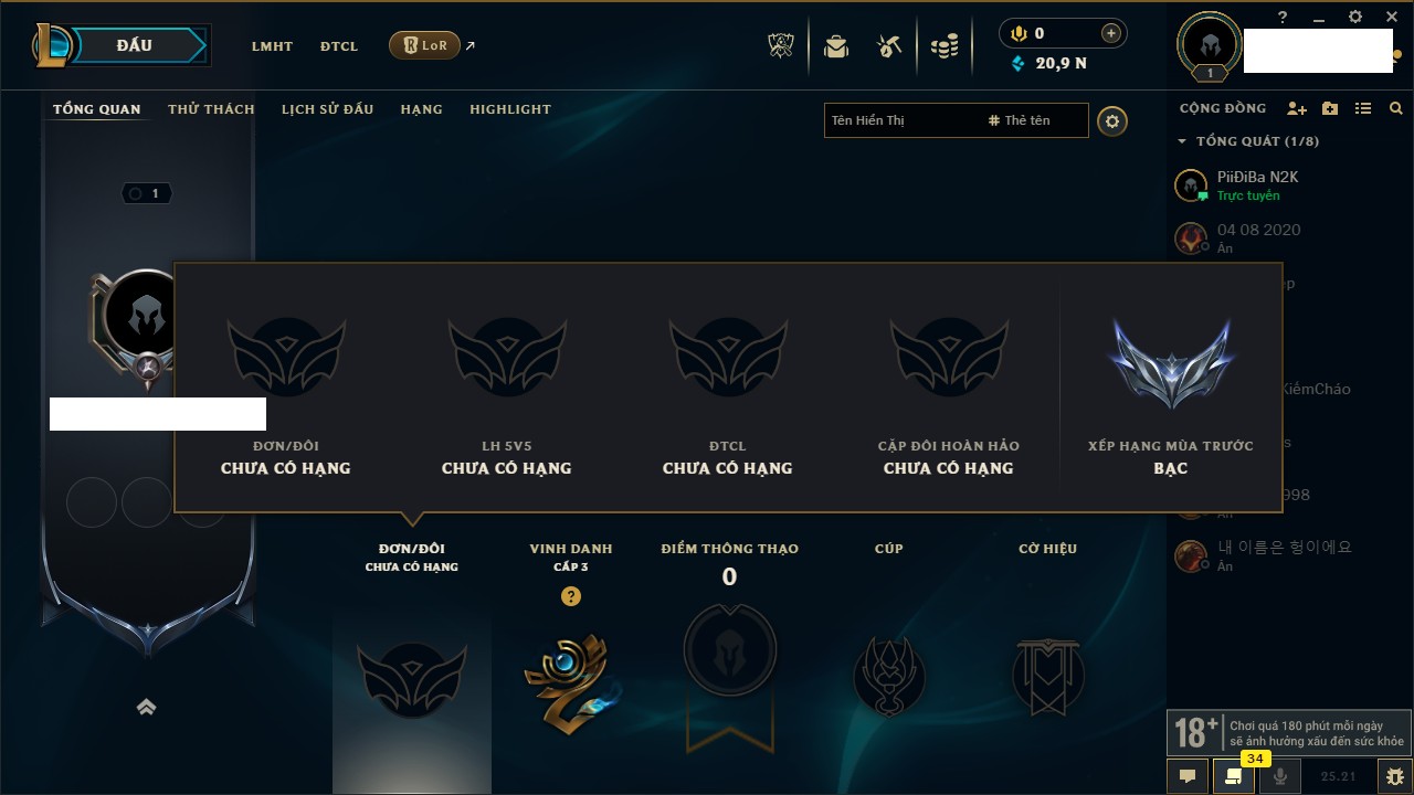 Rank Đơn: Bạc IIIKhung: Chưa có khungTướng: 163 - Còn 66843 THXTrang Phục: 182Rank ĐTCL: Kim Cương IVLinh Thú: 114