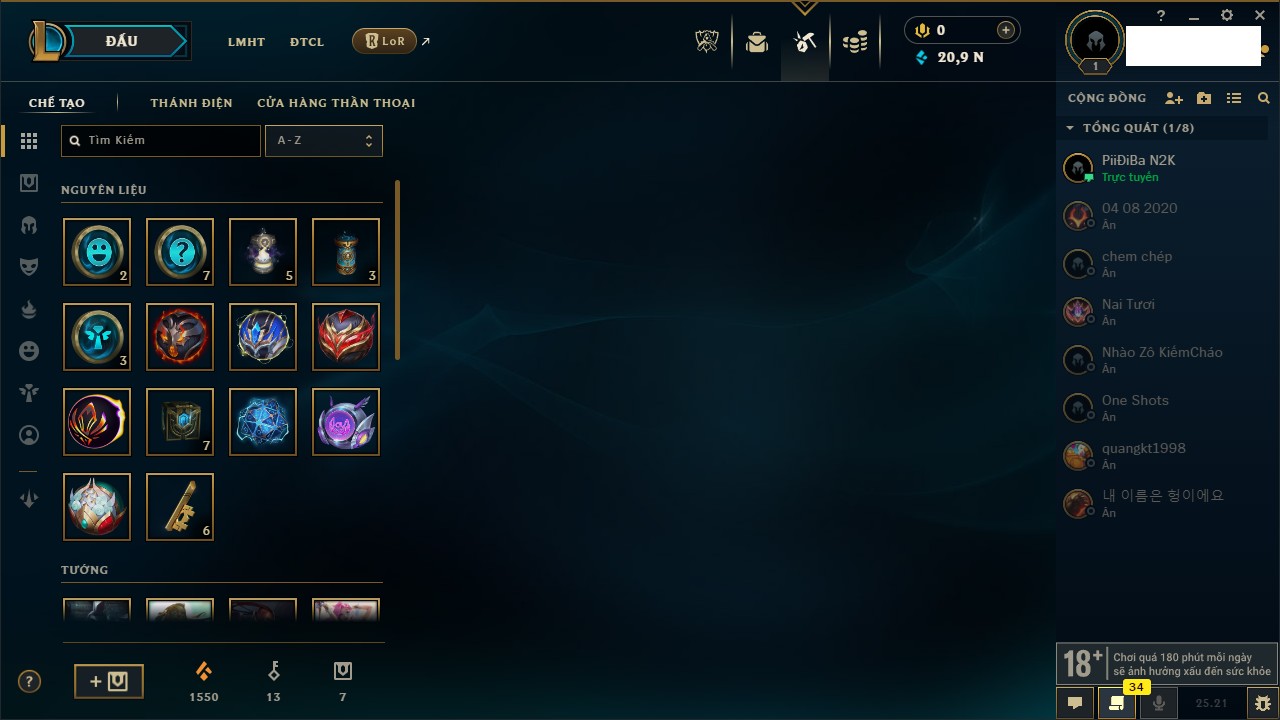 Rank Đơn: Vàng IIIKhung: BạcTướng: 171 - Còn 101359 THXTrang Phục: 88Rank ĐTCL: Kim Cương IVLinh Thú: 200