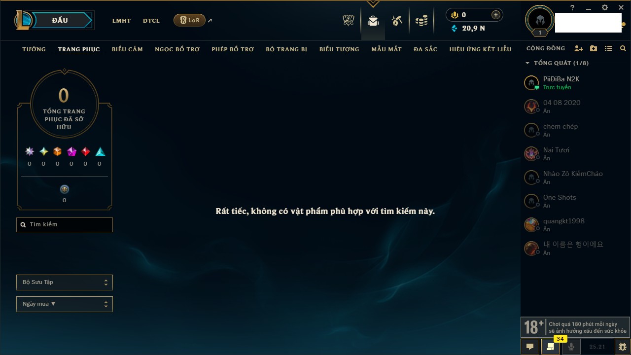 Rank Đơn: Đồng IKhung: ĐồngTướng: 168 - Còn 11447 THXTrang Phục: 245Rank ĐTCL: Chưa RankLinh Thú: 53
