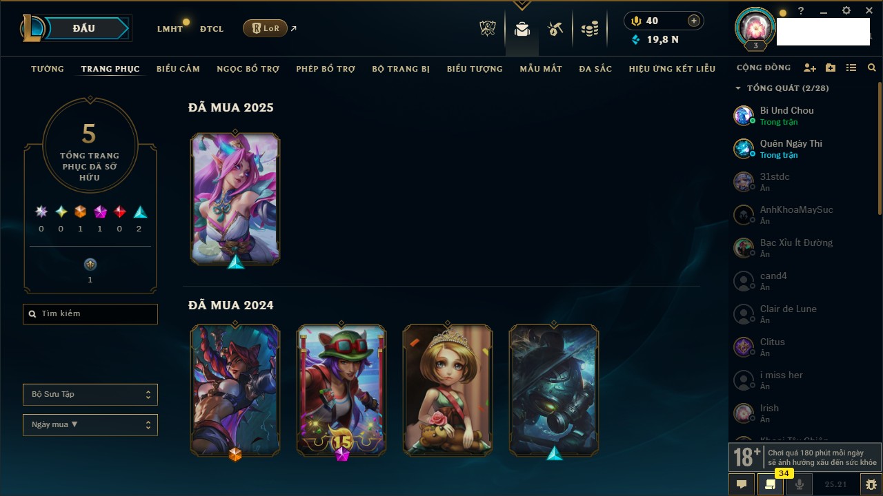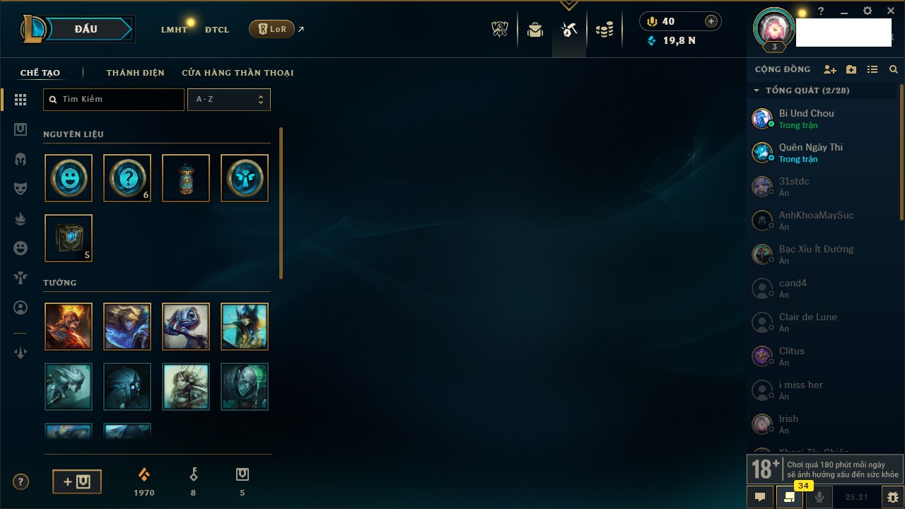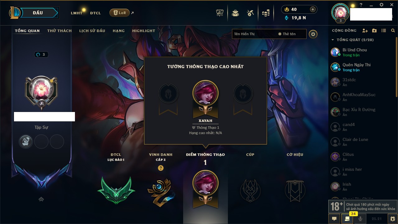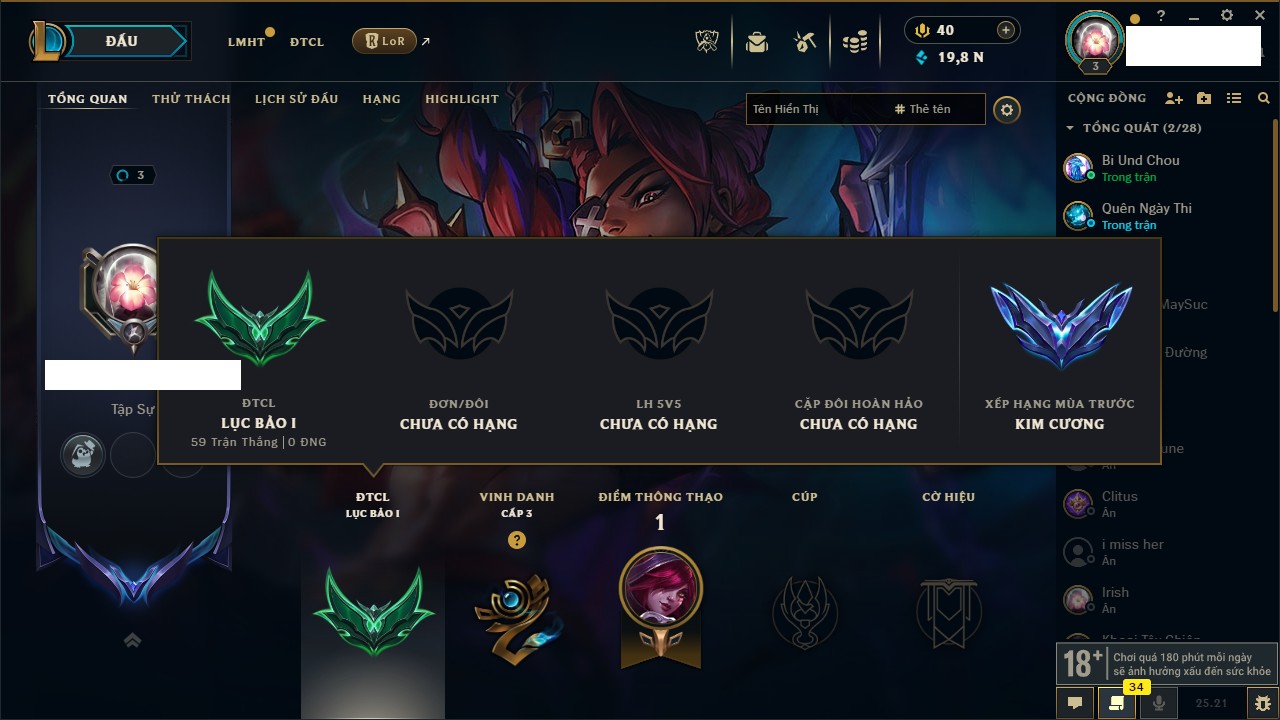 Rank Đơn: Vàng IIIKhung: BạcTướng: 171 - Còn 101359 THXTrang Phục: 88Rank ĐTCL: Kim Cương IVLinh Thú: 200