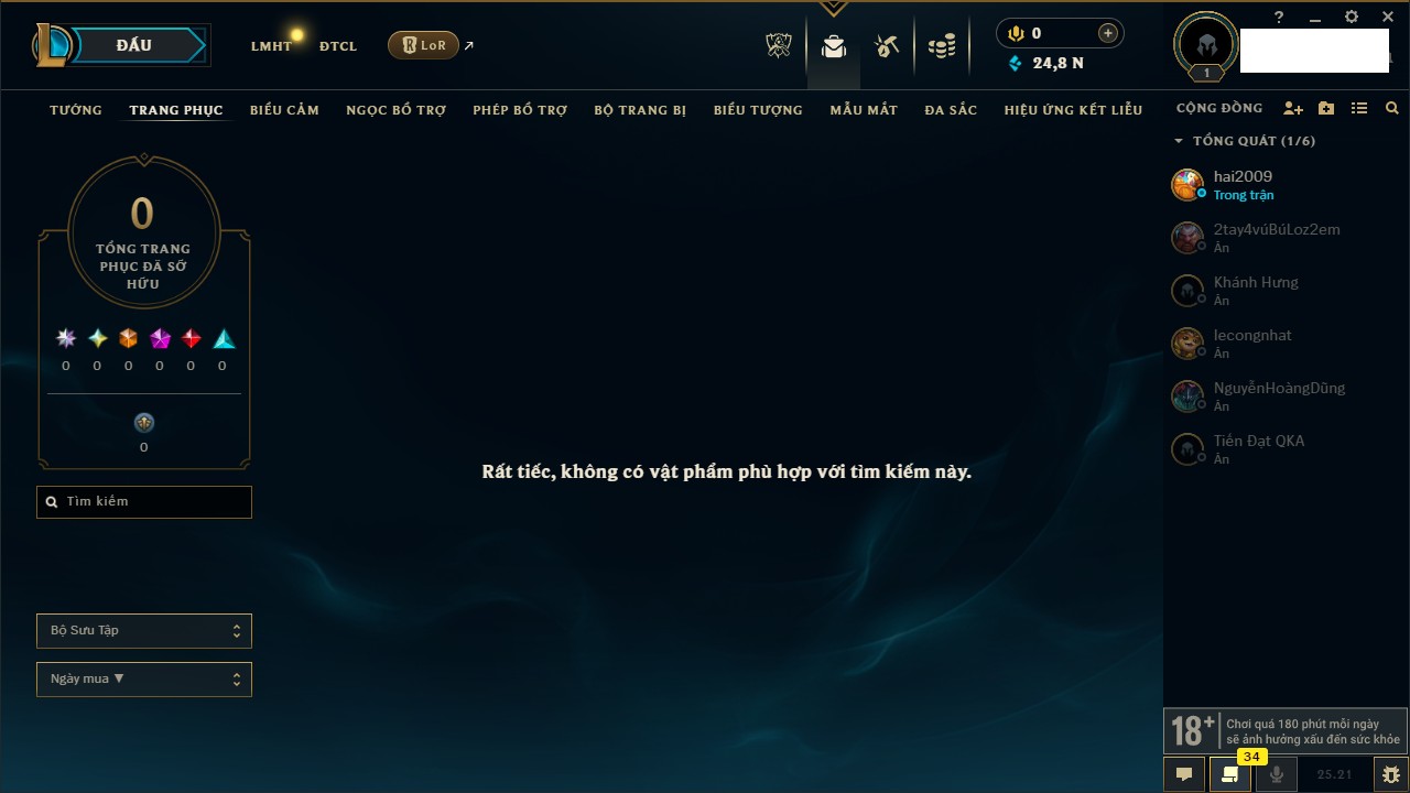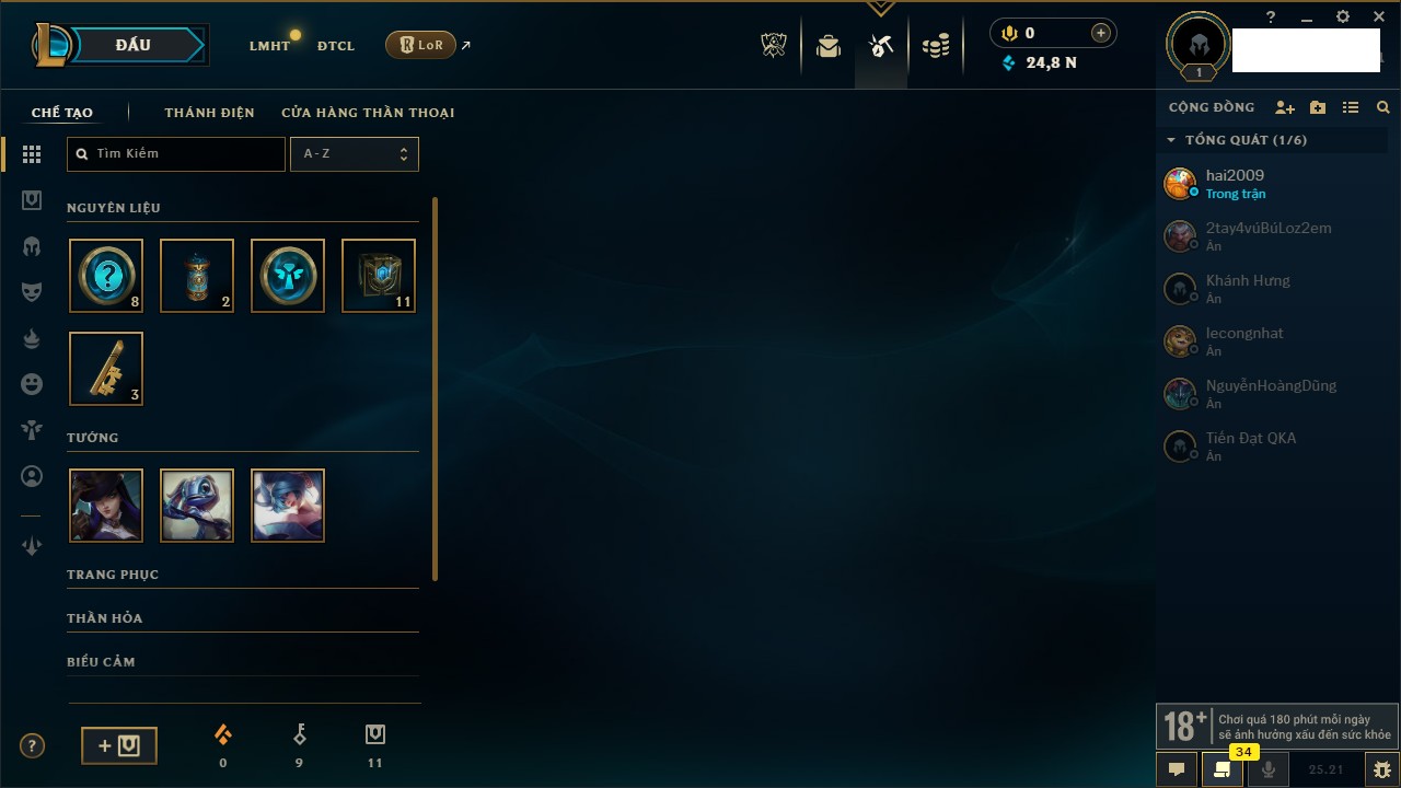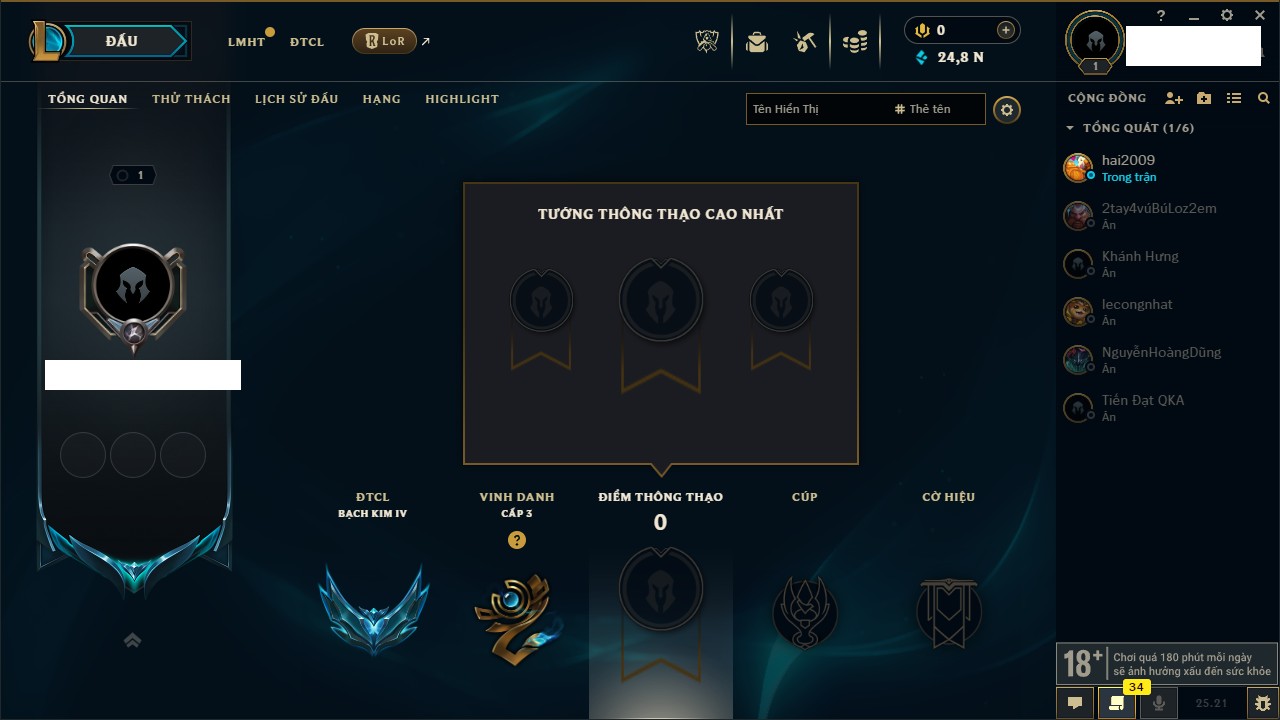 Rank Đơn: Chưa rank mùa nàoKhung: Chưa có khungTướng: 1 - Còn 9000 THXTrang Phục: 0Rank ĐTCL: Bạch Kim IIILinh Thú: 14