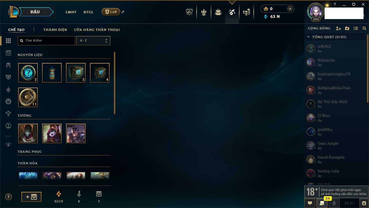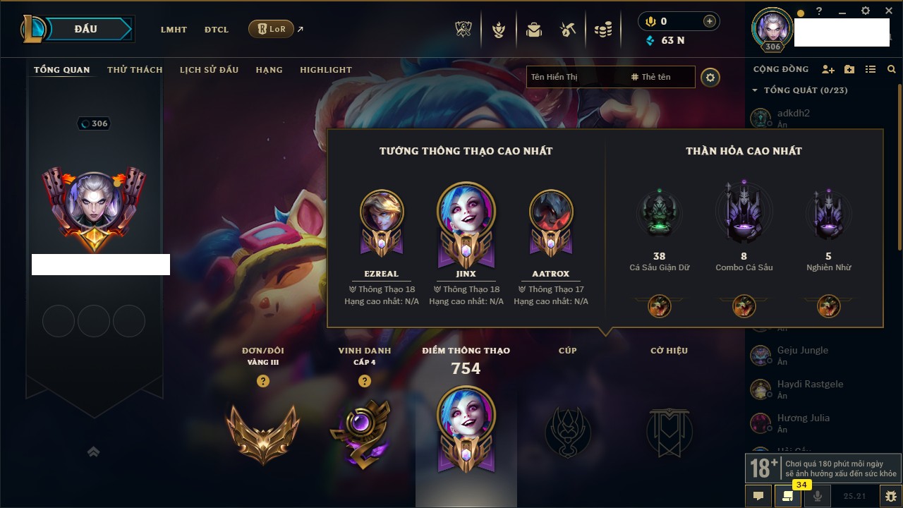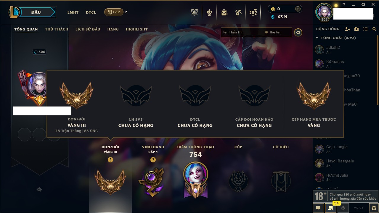 Rank Đơn: Vàng IIIKhung: BạcTướng: 171 - Còn 101359 THXTrang Phục: 88Rank ĐTCL: Kim Cương IVLinh Thú: 200
