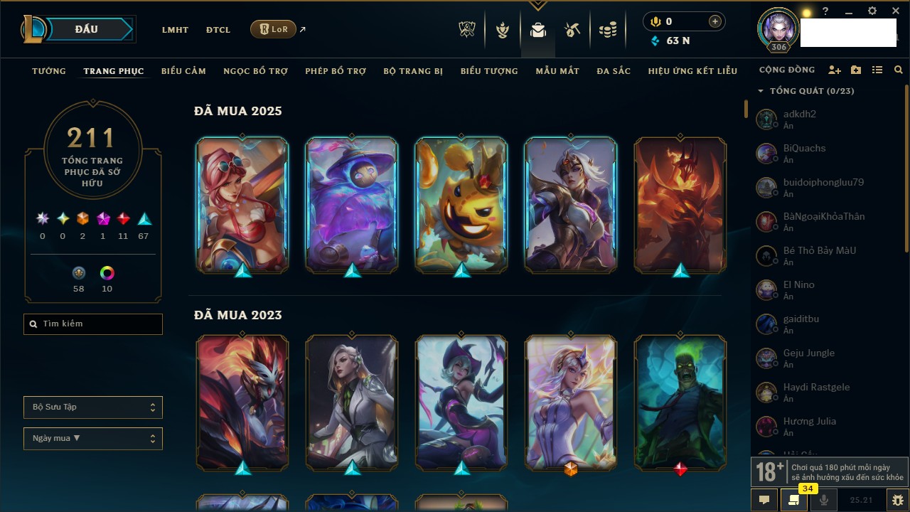 Rank Đơn: Bạc IIIKhung: Chưa có khungTướng: 163 - Còn 66843 THXTrang Phục: 182Rank ĐTCL: Kim Cương IVLinh Thú: 114