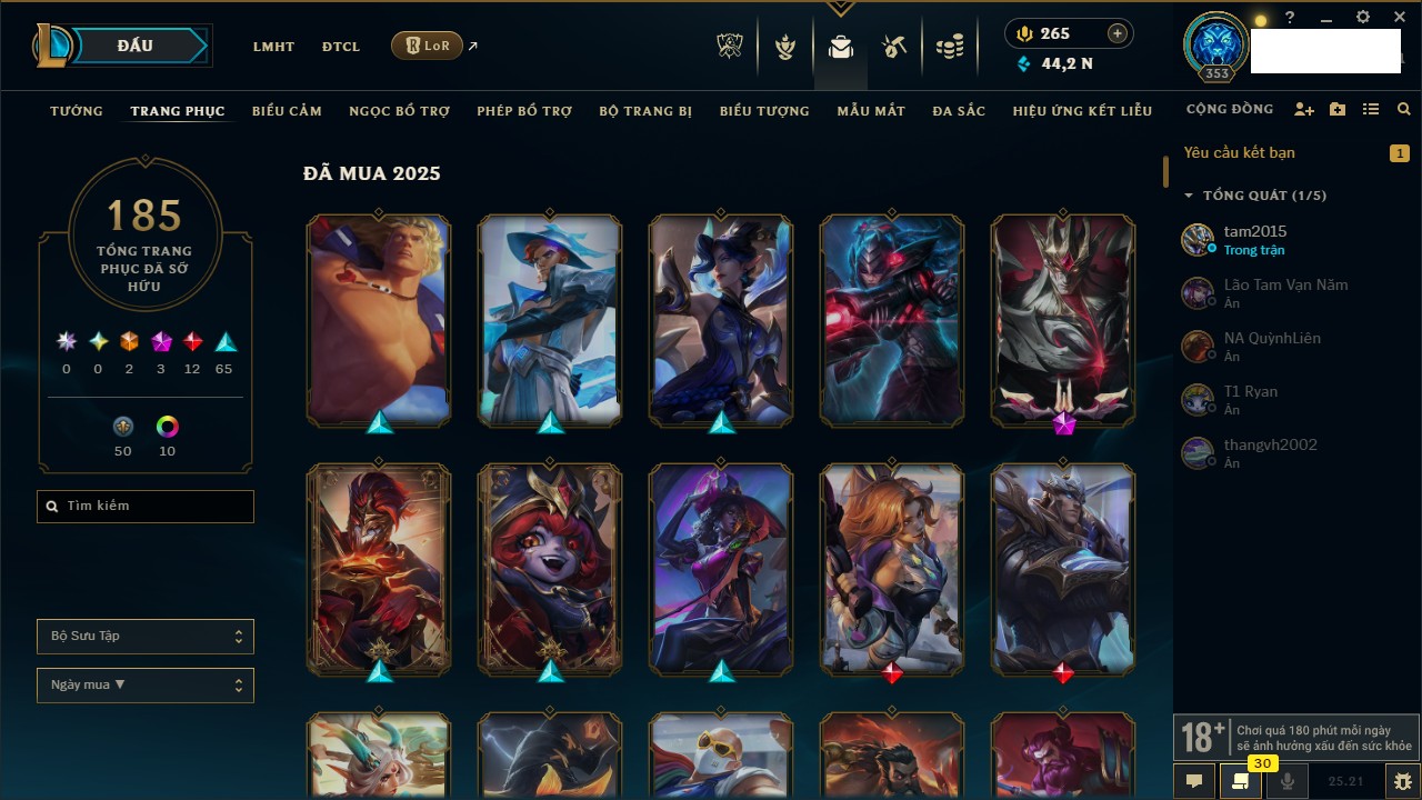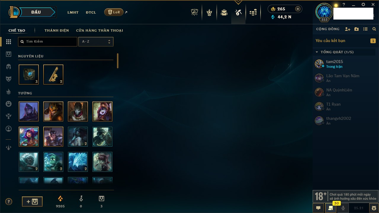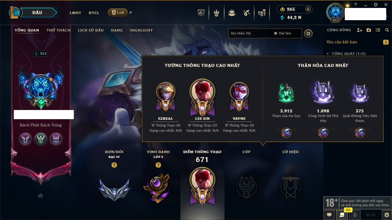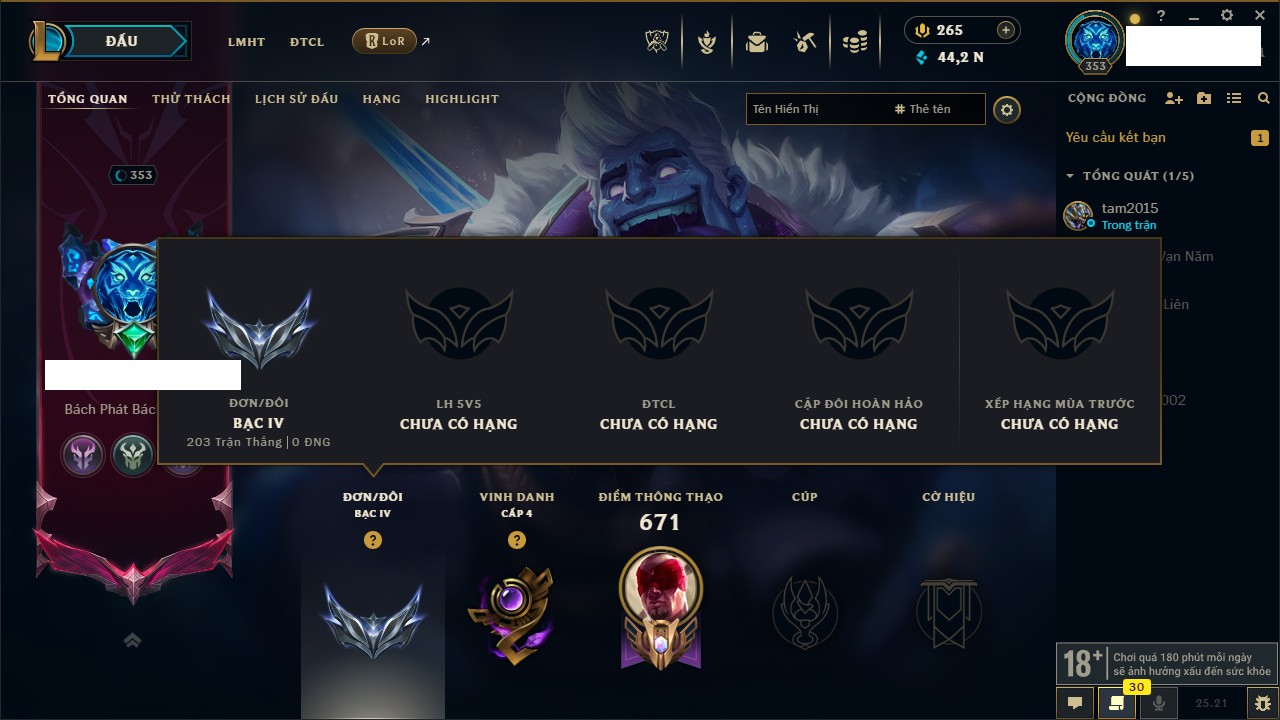 Rank Đơn: Vàng IIIKhung: BạcTướng: 171 - Còn 101359 THXTrang Phục: 88Rank ĐTCL: Kim Cương IVLinh Thú: 200