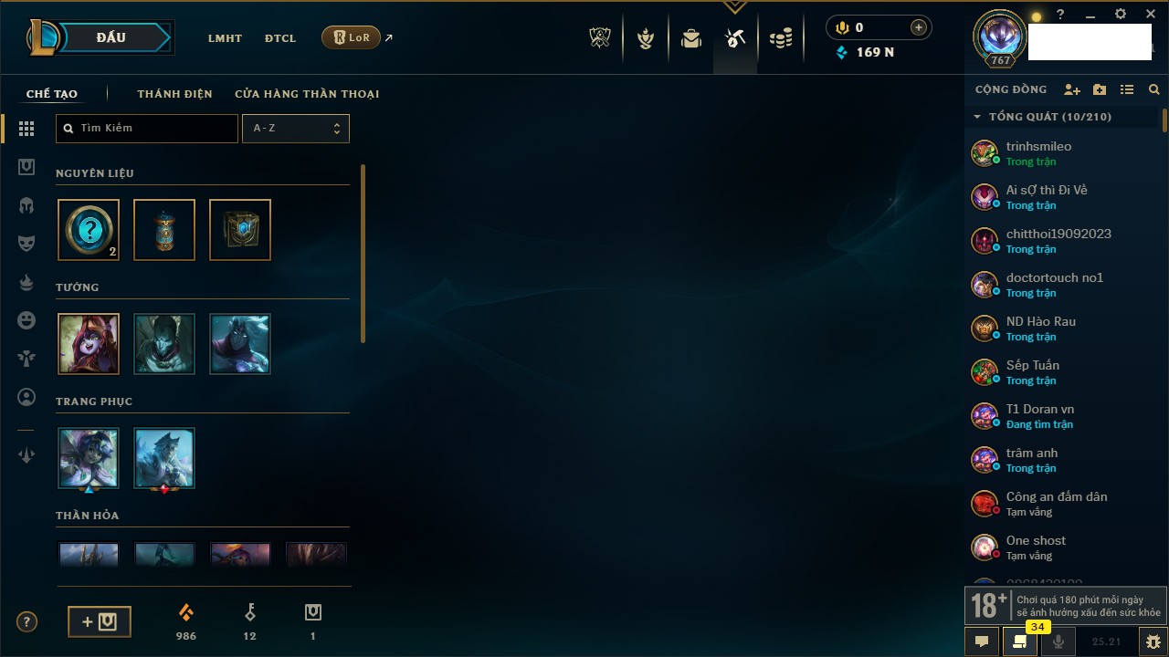 Rank Đơn: Vàng IIIKhung: VàngTướng: 171 - Còn 212486 THXTrang Phục: 201Rank ĐTCL: Bạc ILinh Thú: 79