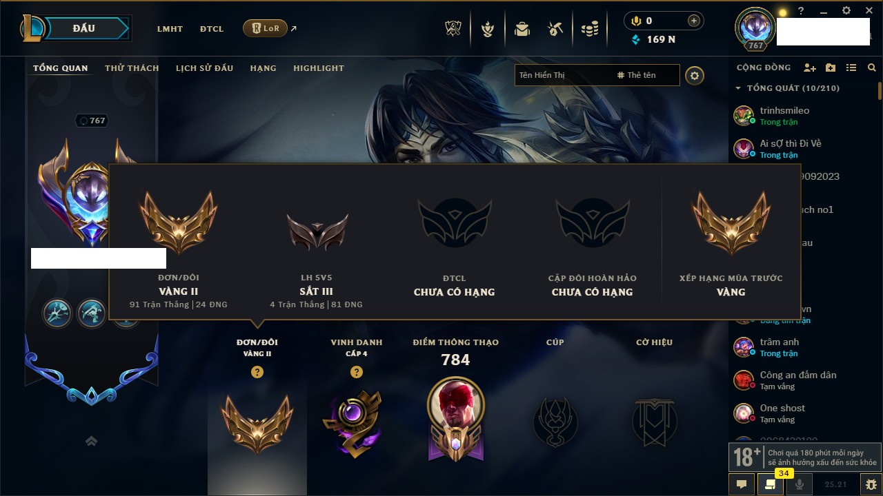 Rank Đơn: Sắt IIIKhung: SắtTướng: 171 - Còn 62070 THXTrang Phục: 198Rank ĐTCL: Bạch Kim IIILinh Thú: 237