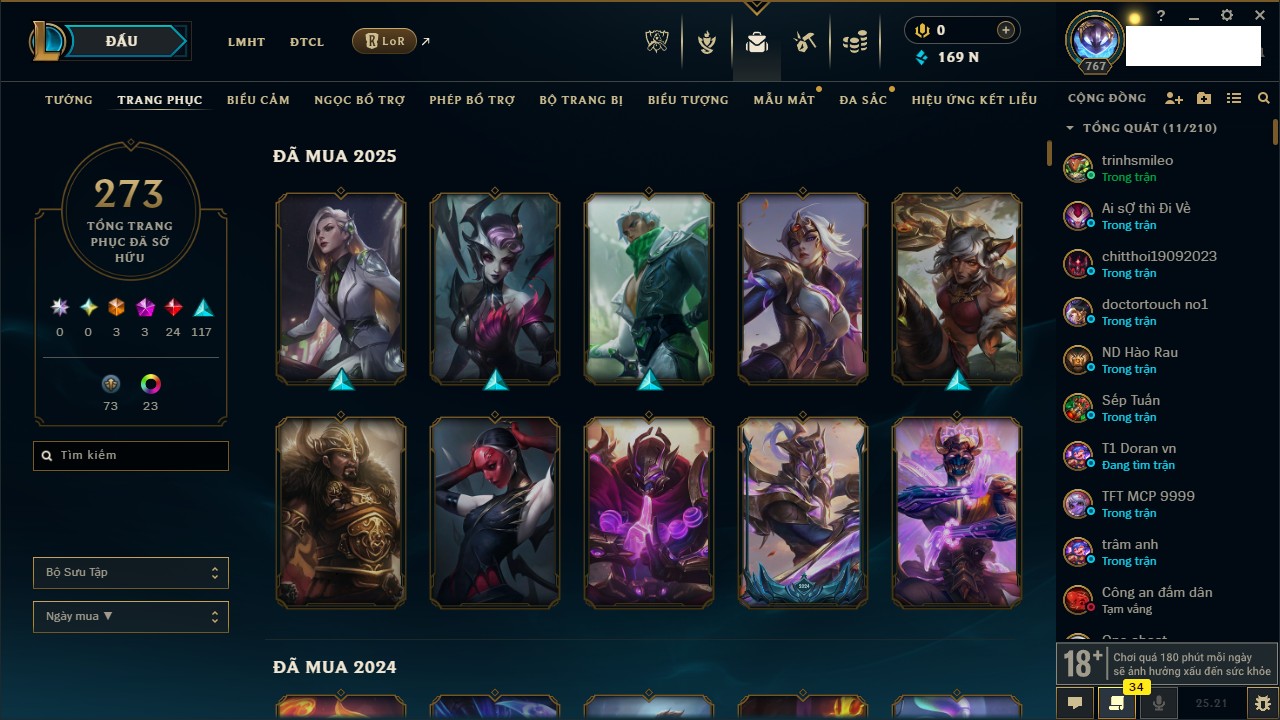 Rank Đơn: Vàng IIKhung: VàngTướng: 171 - Còn 219803 THXTrang Phục: 254Rank ĐTCL: Chưa RankLinh Thú: 78