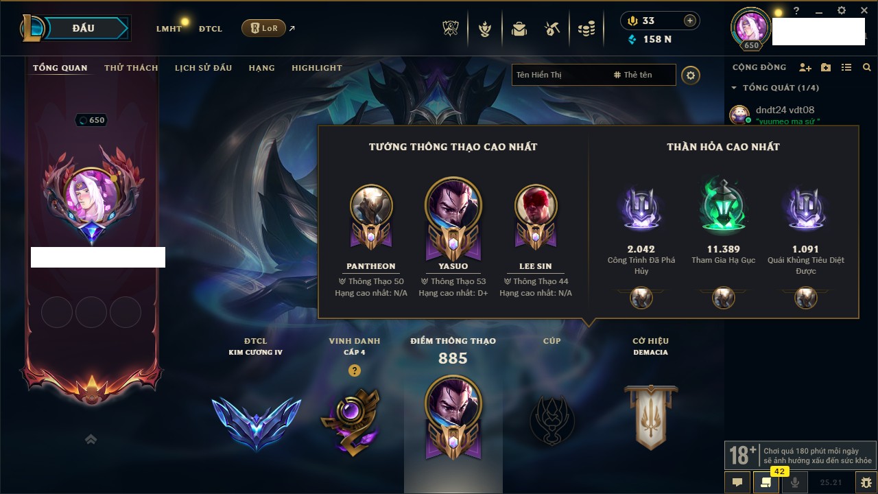 Rank Đơn: Chưa rank mùa nào Khung: Chưa có khung Tướng: 4 - Còn 35950 THX Trang Phục: 1 Rank ĐTCL: Bạch Kim IV Linh Thú: 228