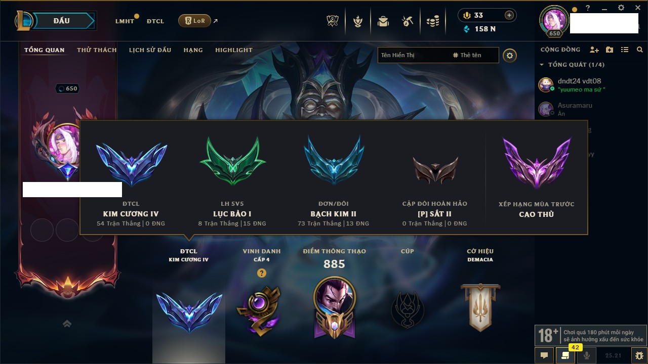 Rank Đơn: Bạch Kim III Khung: Bạch kim Tướng: 171 - Còn 79166 THX Trang Phục: 441 Rank ĐTCL: Bạc IV Linh Thú: 354