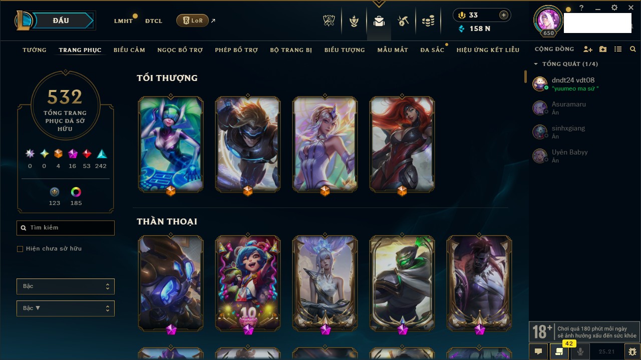 Rank Đơn: Bạch Kim II Khung: Lục Bảo Tướng: 171 - Còn 158339 THX Trang Phục: 532 Rank ĐTCL: Kim Cương IV Linh Thú: 408