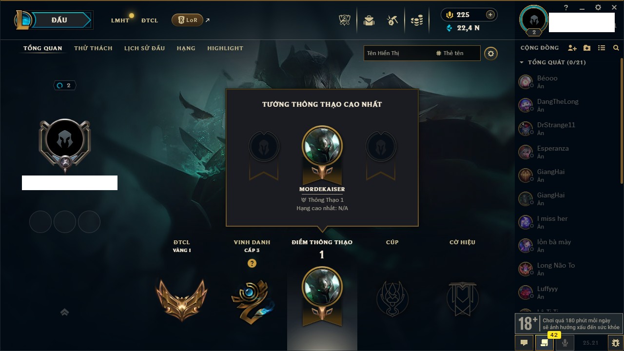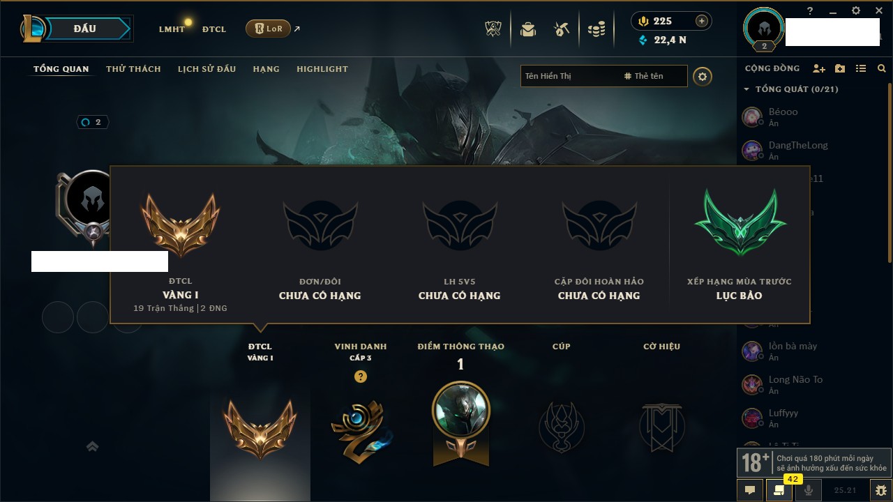 Rank Đơn: Bạc IIKhung: Bạch kimTướng: 169 - Còn 81813 THXTrang Phục: 301Rank ĐTCL: Chưa RankLinh Thú: 140