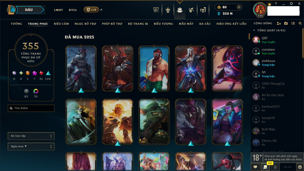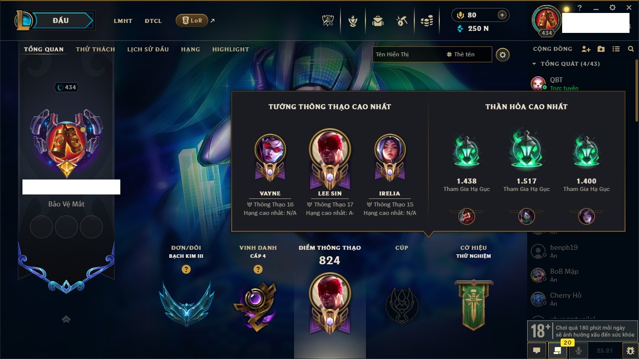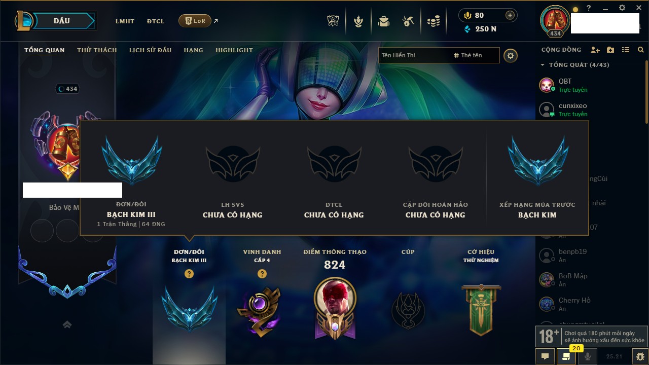 Rank Đơn: Bạch Kim IIIKhung: Bạch kimTướng: 171 - Còn 250924 THXTrang Phục: 355Rank ĐTCL: Chưa RankLinh Thú: 230