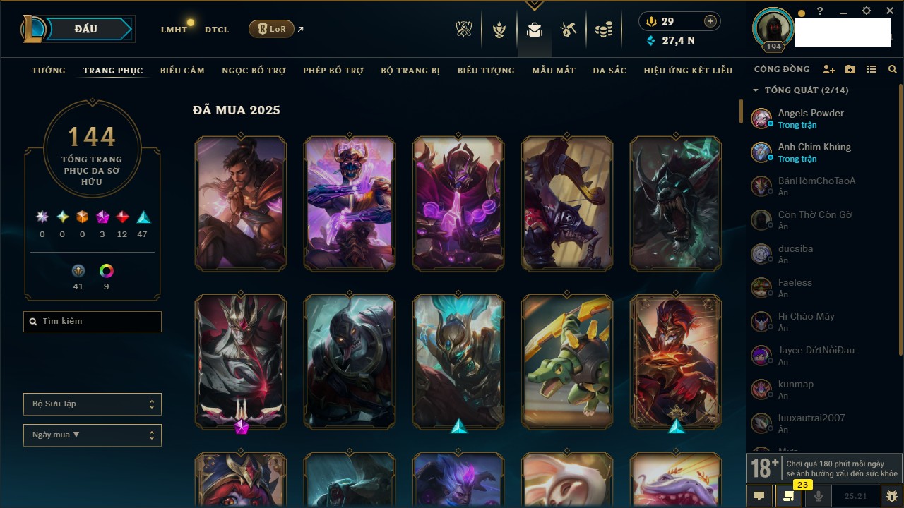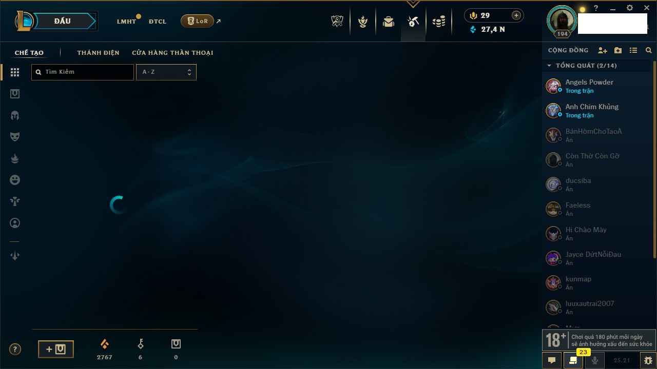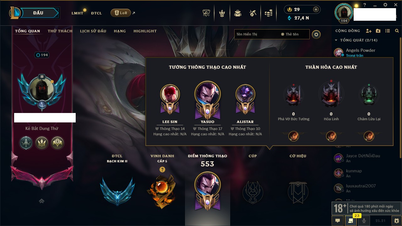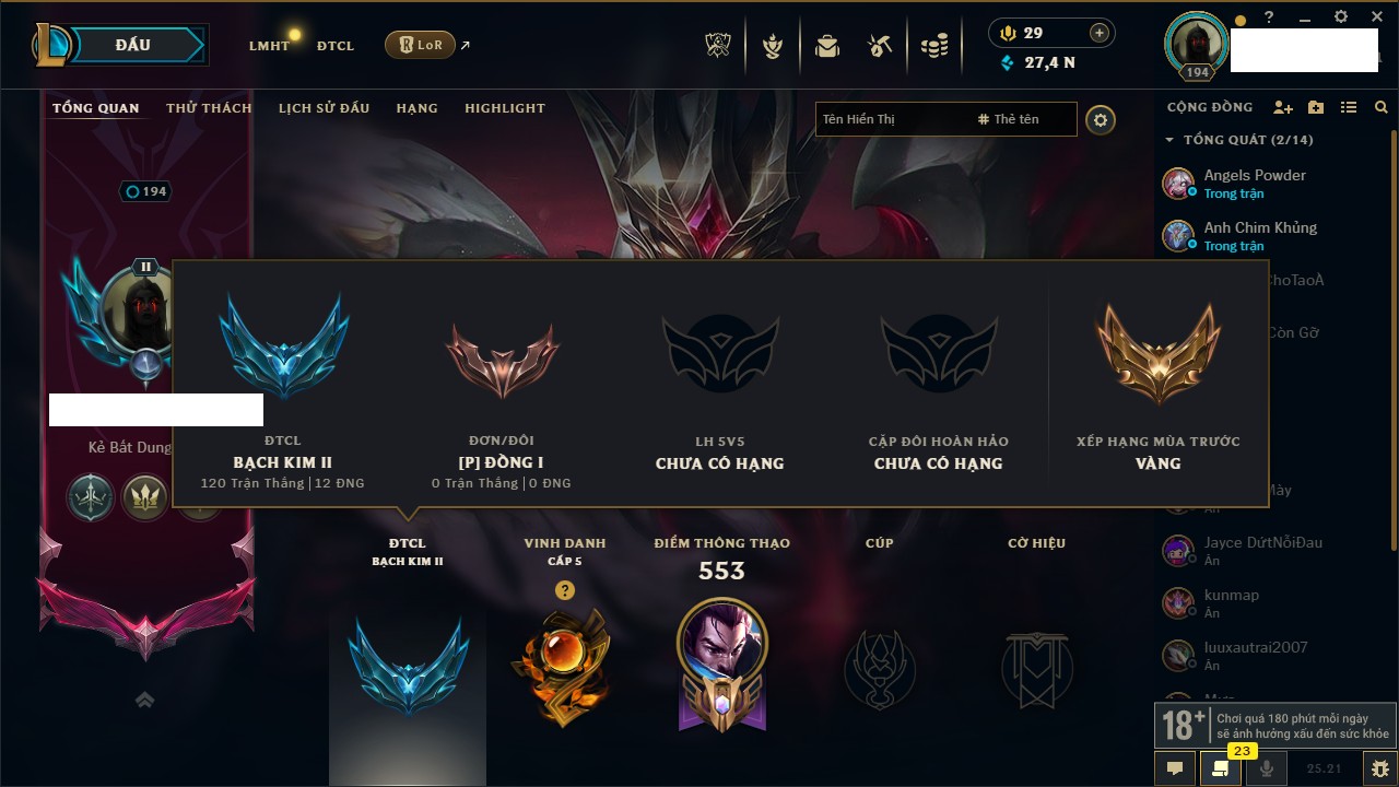 Rank Đơn: Bạch Kim IIKhung: Bạch kimTướng: 171 - Còn 316137 THXTrang Phục: 89Rank ĐTCL: Bạch Kim IIILinh Thú: 94