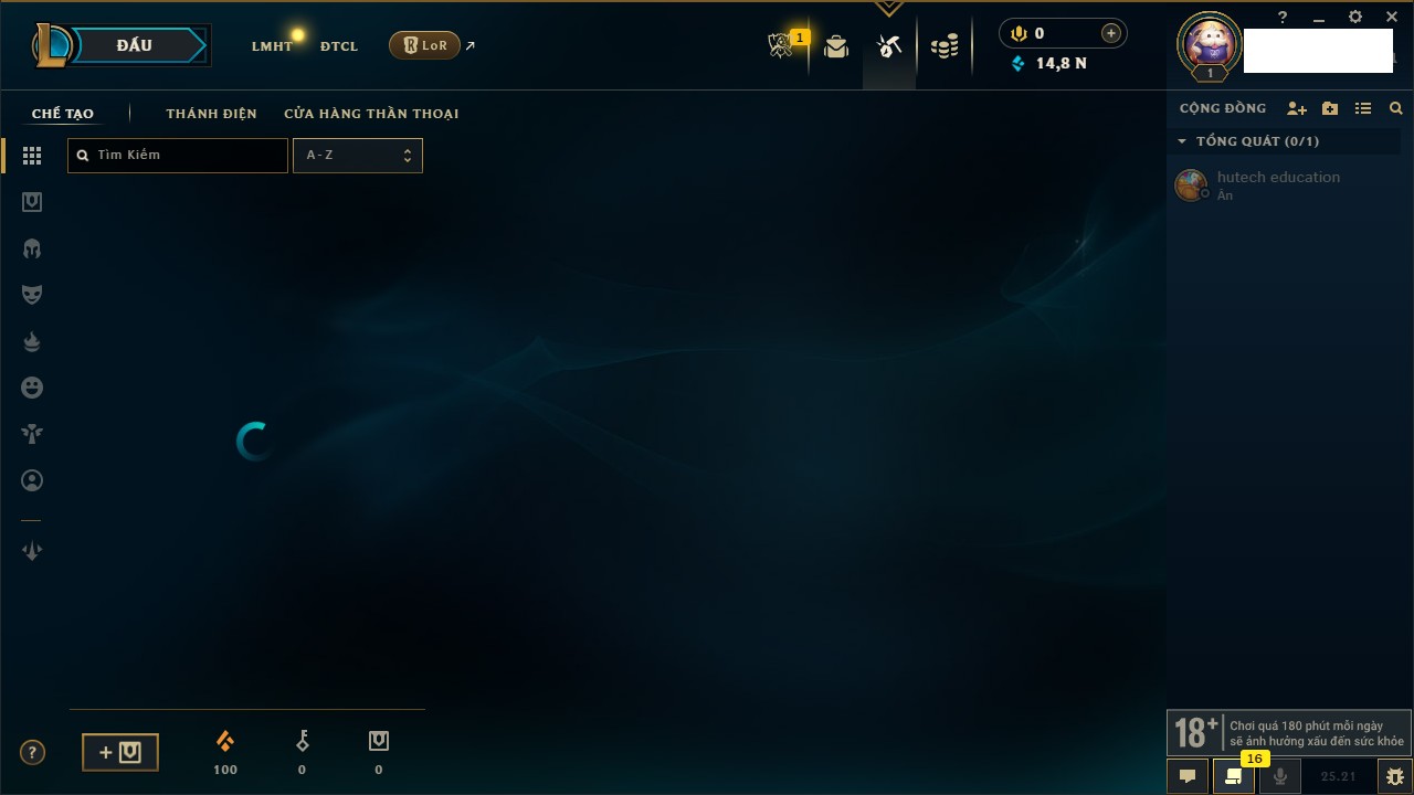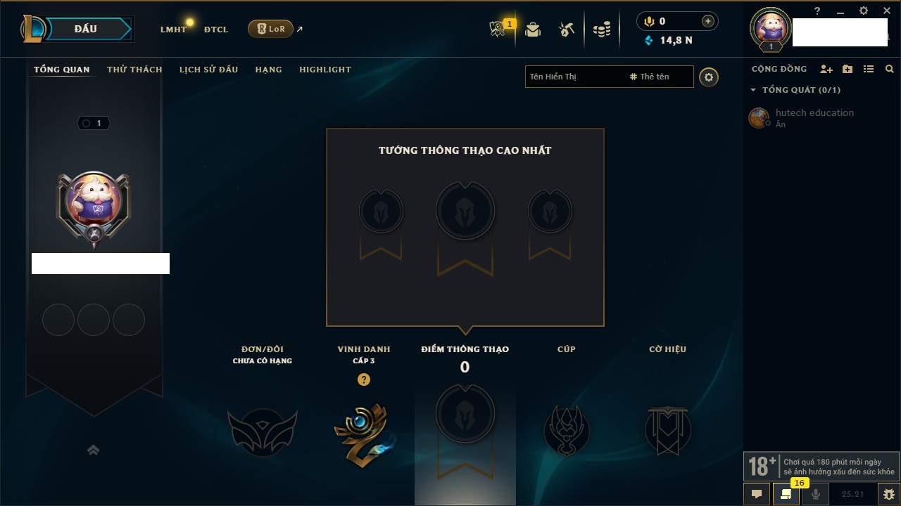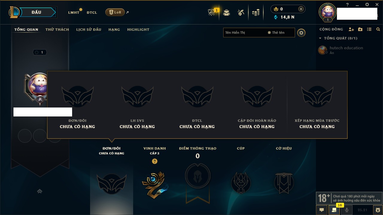 Rank Đơn: Chưa rank mùa nàoKhung: Chưa có khungTướng: 2 - Còn 9000 THXTrang Phục: 0Rank ĐTCL: Bạch Kim IIILinh Thú: 31