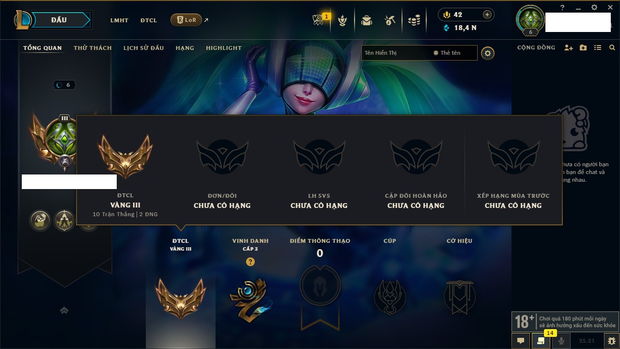 Rank Đơn: Bạc IIIKhung: Chưa có khungTướng: 171 - Còn 21493 THXTrang Phục: 252Rank ĐTCL: Bạch Kim IVLinh Thú: 123