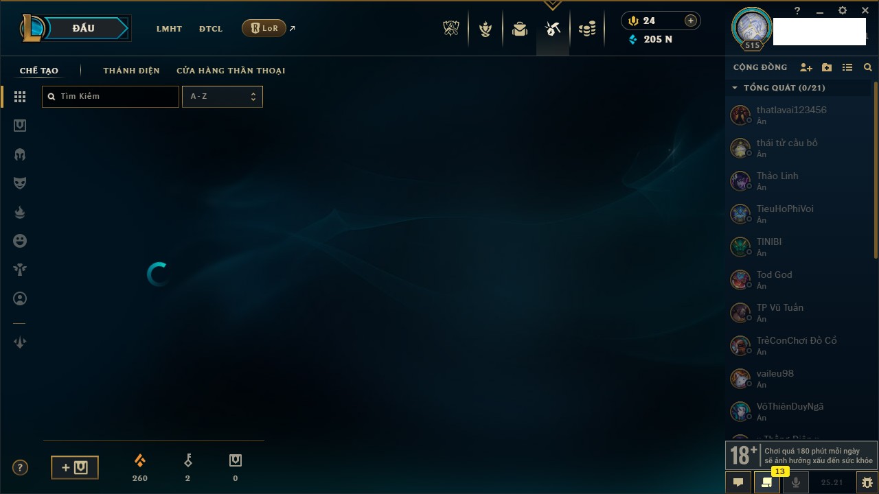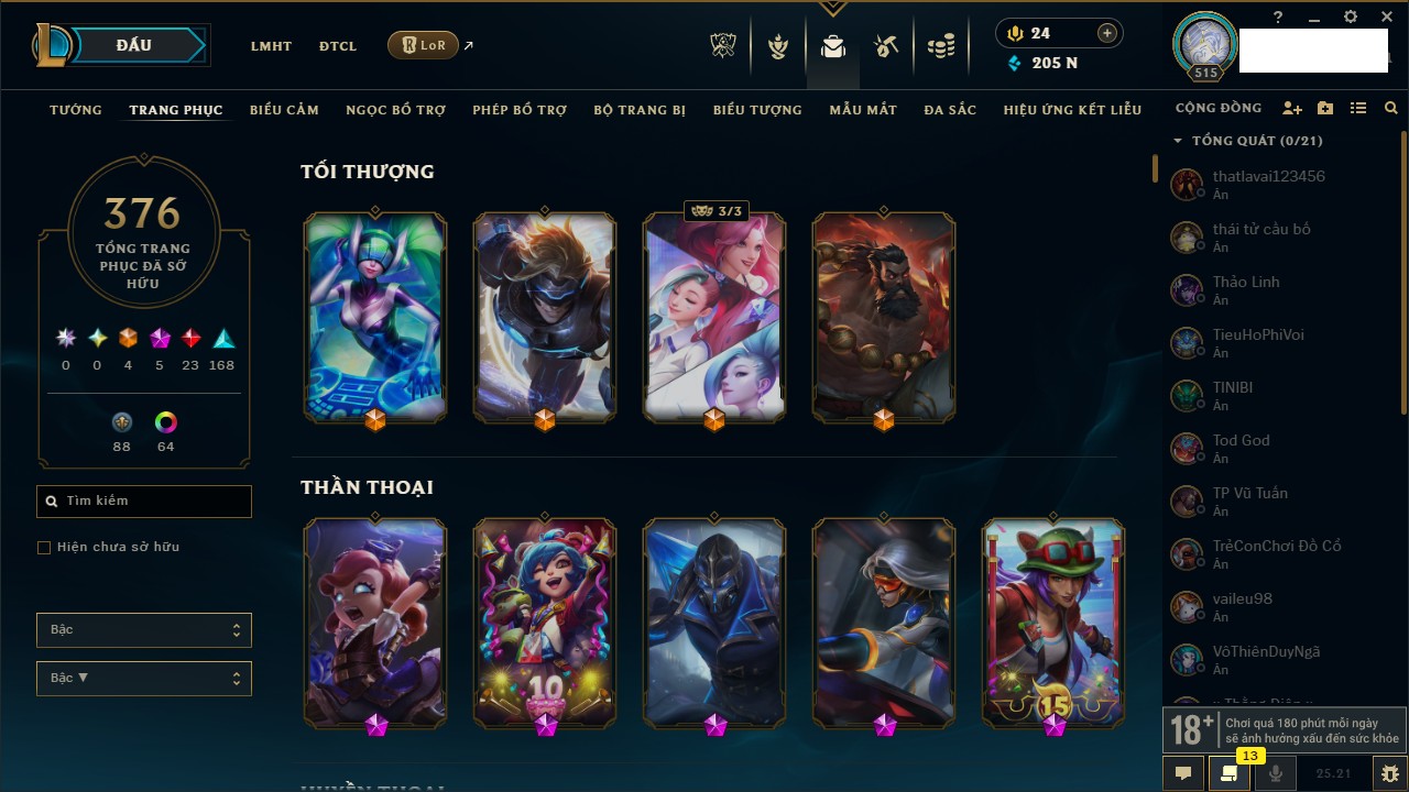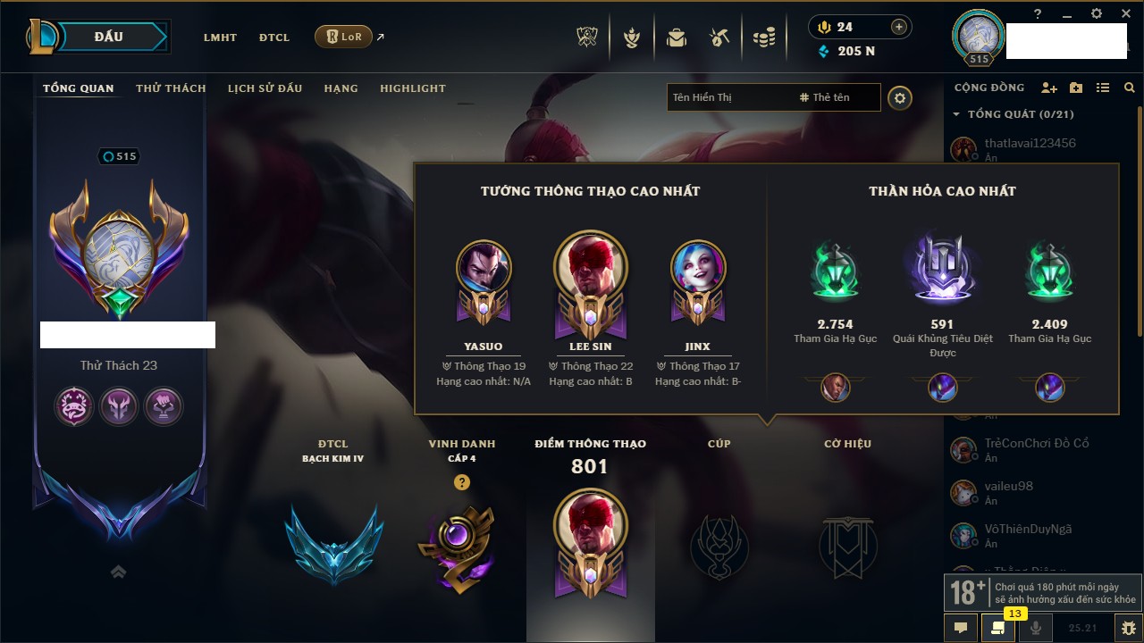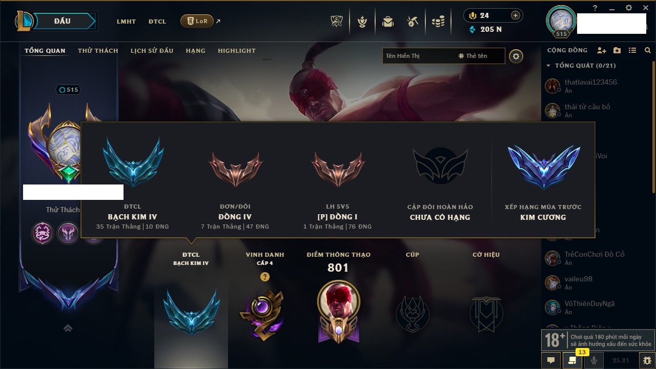 Rank Đơn: Vàng IKhung: Bạch kimTướng: 170 - Còn 212450 THXTrang Phục: 214Rank ĐTCL: Bạch Kim IVLinh Thú: 221