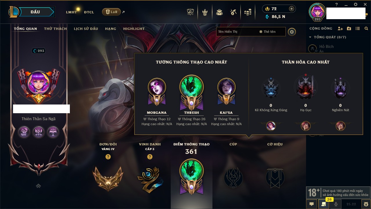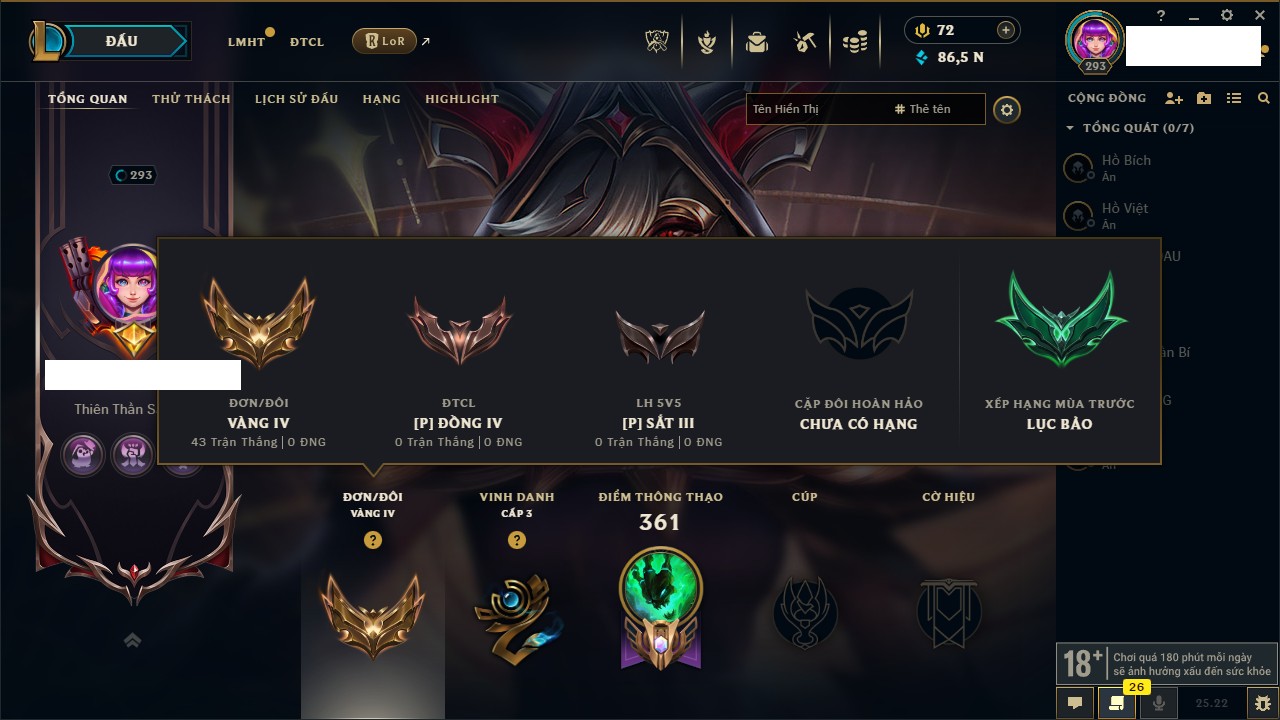 Rank Đơn: Bạc III Khung: Bạc Tướng: 170 - Còn 30078 THX Trang Phục: 225 Rank ĐTCL: Chưa Rank Linh Thú: 138