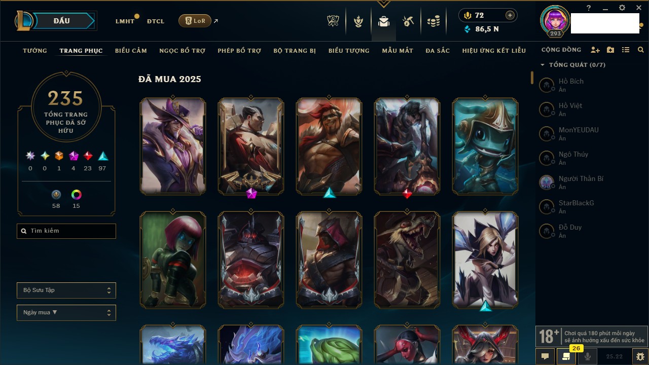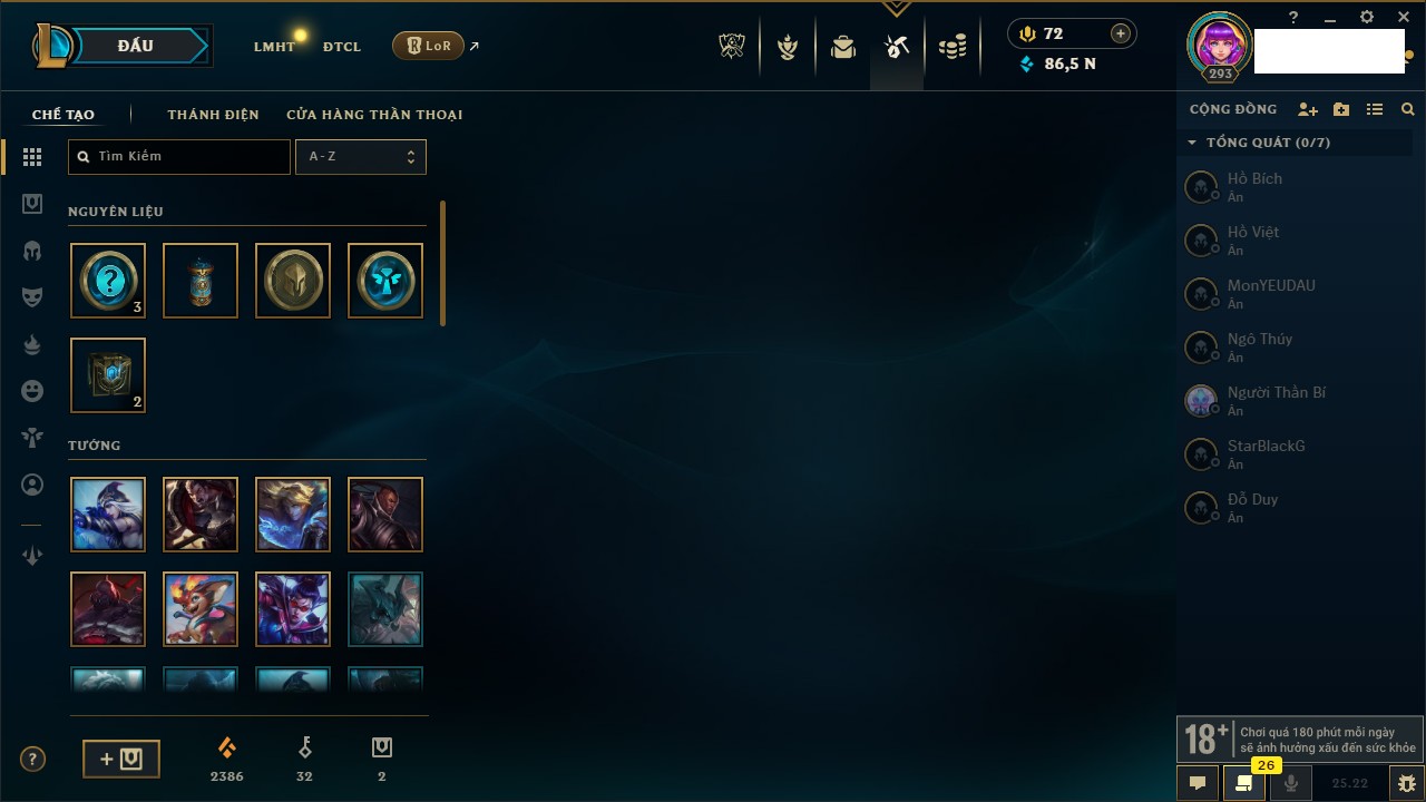 Rank Đơn: Chưa rank mùa nào Khung: Chưa có khung Tướng: 56 - Còn 2186 THX Trang Phục: 1 Rank ĐTCL: Chưa Rank Linh Thú: 25