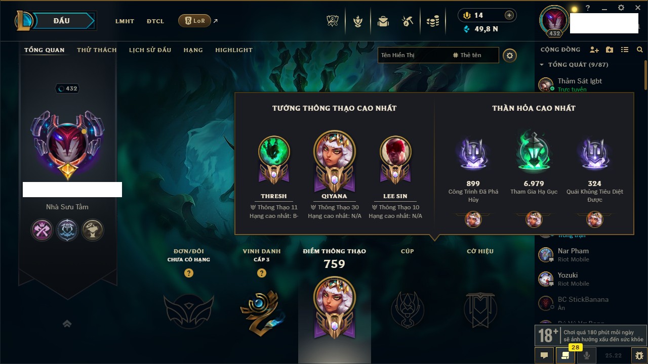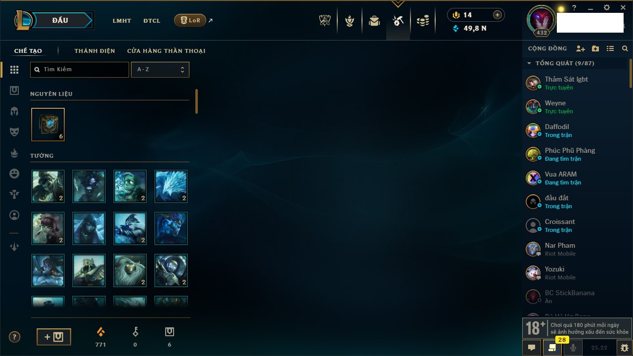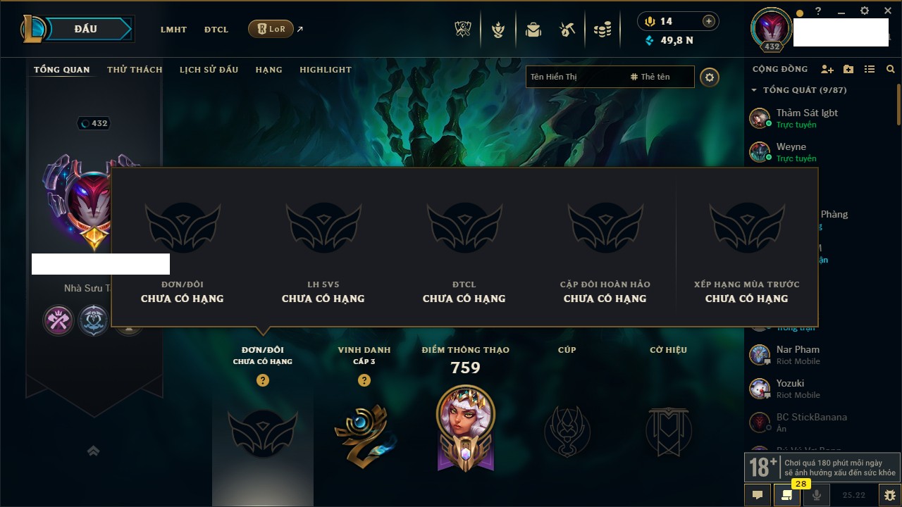 Rank Đơn: Vàng IKhung: BạcTướng: 171 - Còn 60584 THXTrang Phục: 286Rank ĐTCL: Vàng IIILinh Thú: 117