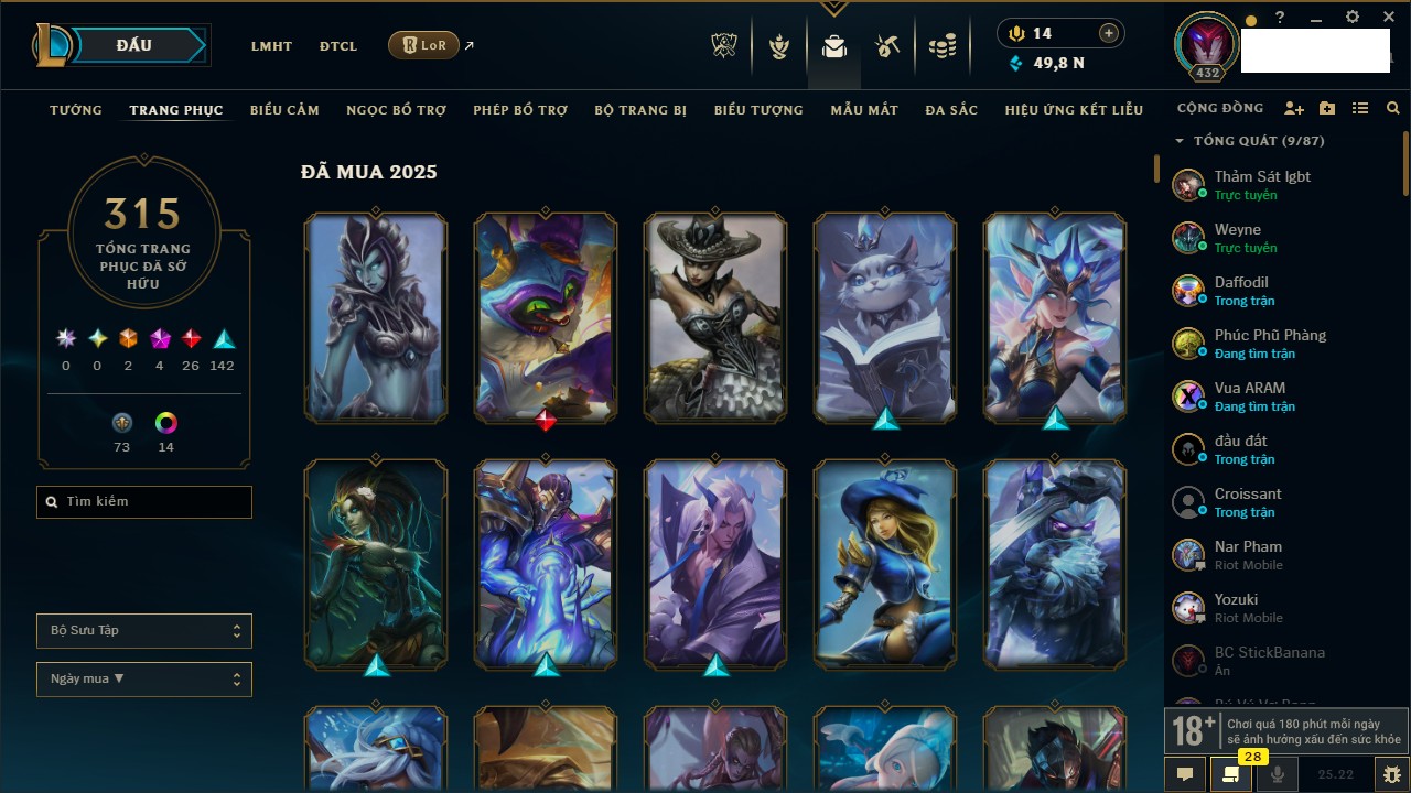 Rank Đơn: Vàng IIIKhung: VàngTướng: 171 - Còn 88128 THXTrang Phục: 329Rank ĐTCL: Chưa RankLinh Thú: 41