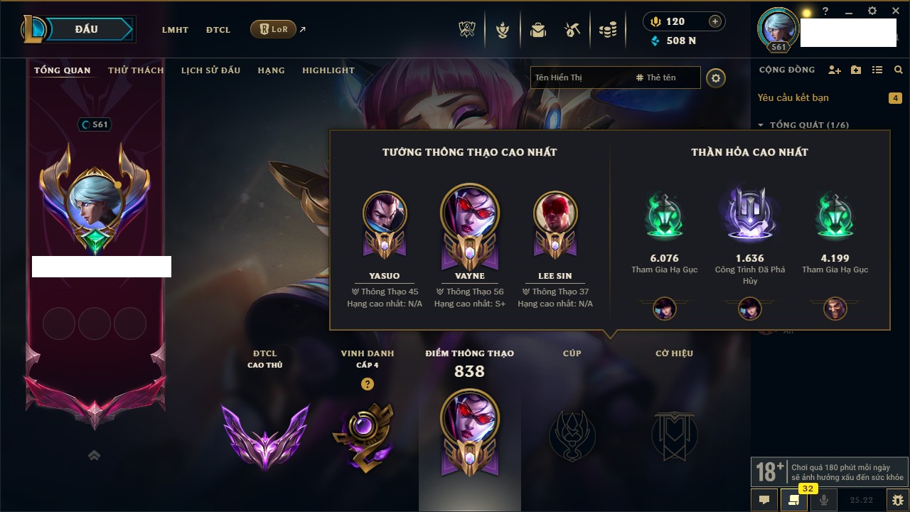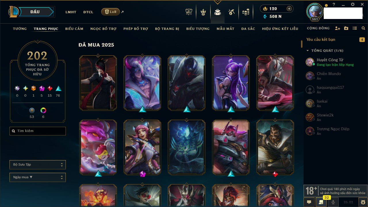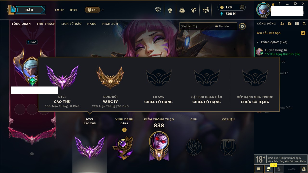 Rank Đơn: Vàng IIKhung: VàngTướng: 171 - Còn 219803 THXTrang Phục: 254Rank ĐTCL: Chưa RankLinh Thú: 78
